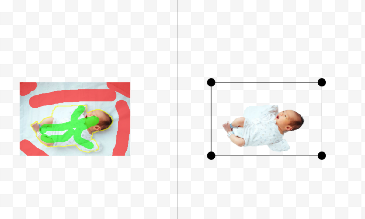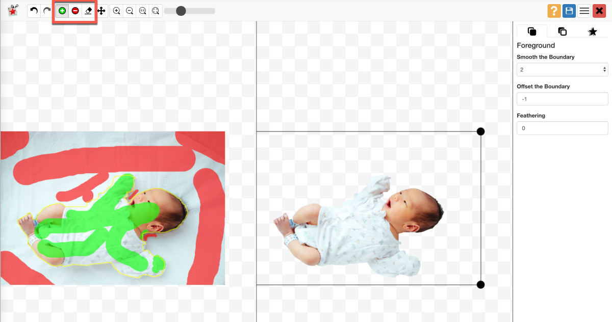 比如阿湯想將湯包去背,左邊區域是讓你畫紅綠線的地方,會即時顯示去背的邊緣黃線,也會在右邊區域即時顯示成果。