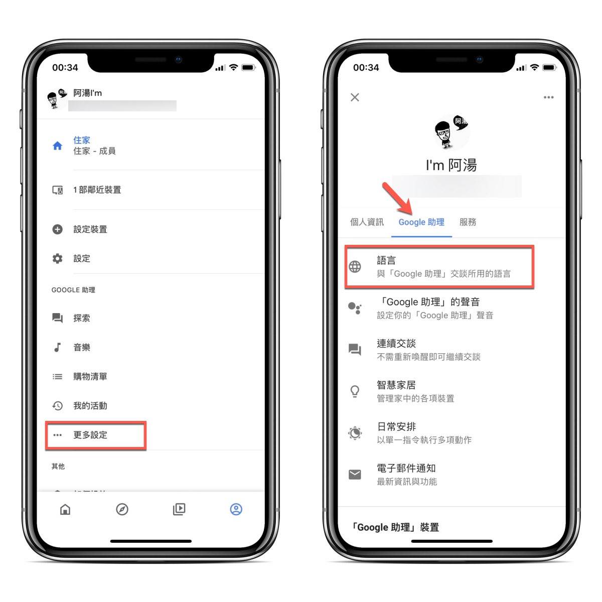 以上 Android 手機就設定完了,接下來請使用 iPhone 進入 Google Home APP,同樣點擊最右邊的頁籤,再點擊「更多設定」,進入 Google 助理中的「語言」設定。