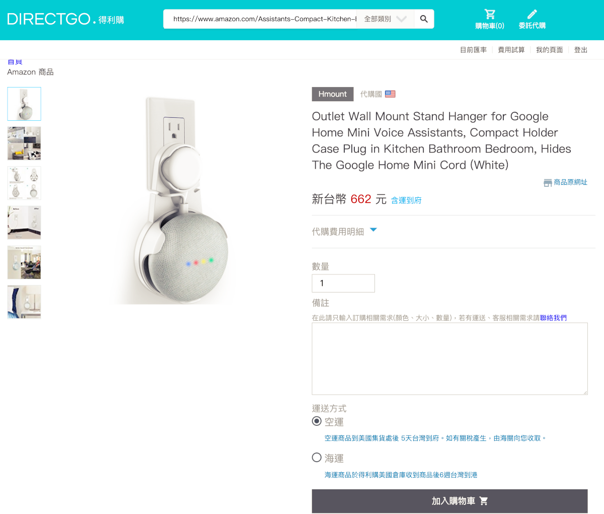 然後貼到搜尋框裡按下 Enter,就會出現代購費用了,目前美國 Amazon 上的商品都可以用這方式直接獲得報價,完全不用提交代購單,直接就可以下單,上面顯示的報價都是「含運到府」,一般來說小東西一定是空運比較划算,因為海運普遍會有最低消費額,如果你沒達到相當的重量或體積,選海運一定都不划算的。