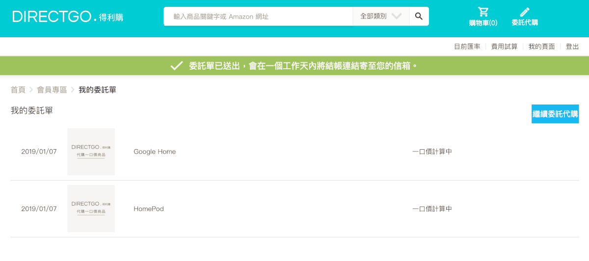 當你完成委託代購單後,在會員專區裡可以看到價格計算中,隨時都會在網頁上更新,也會透過 Email 通知你已經完成報價。
