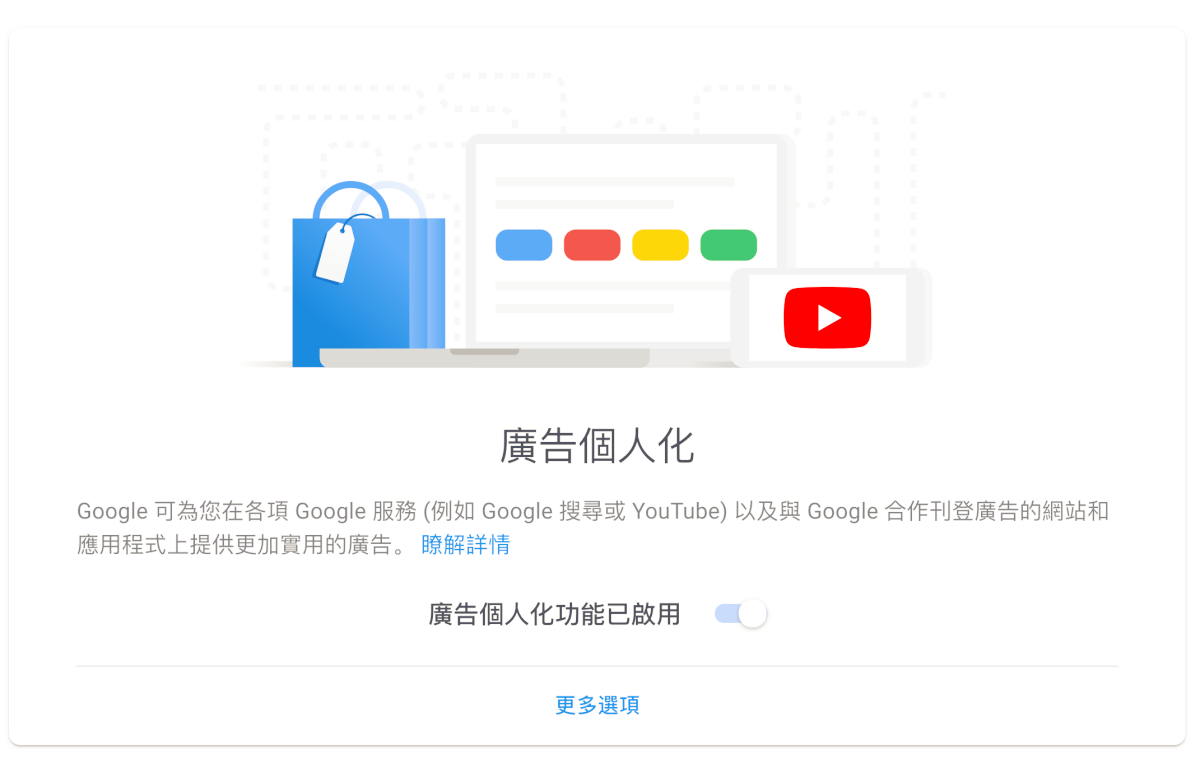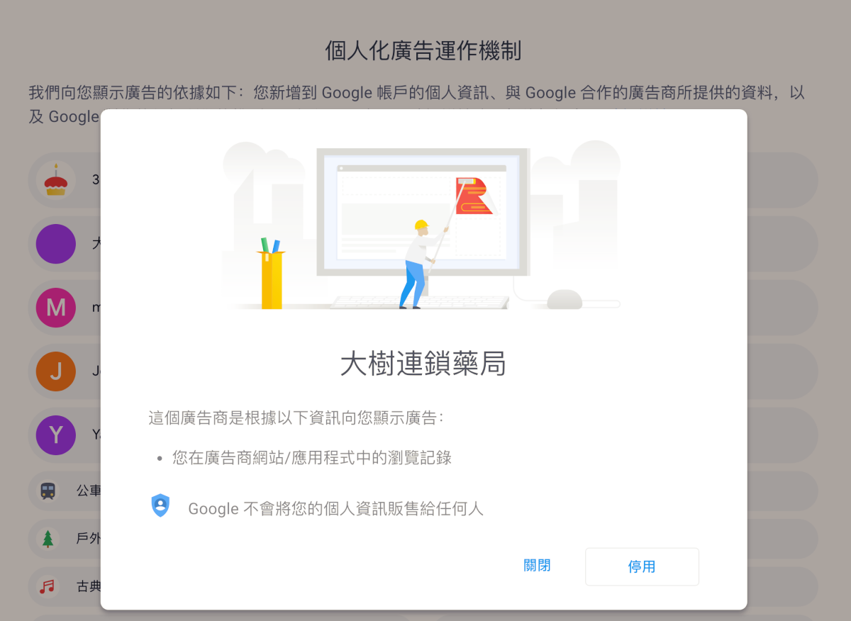 廣告設定頁」進行設定,如果完全不想被關聯,你也可以直接將廣告個人化停用,就不會依據你搜尋的關鍵字出現廣告了,但如果你只是想去掉部份關聯內容就往下來看。