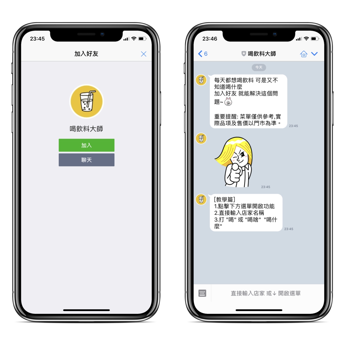 喝飲料大師」的 LINE 帳號將他加入,或者用電腦點擊連結後,再用手機掃描 QR Code 也是可以的。