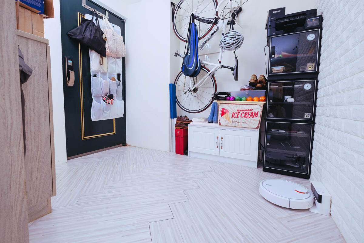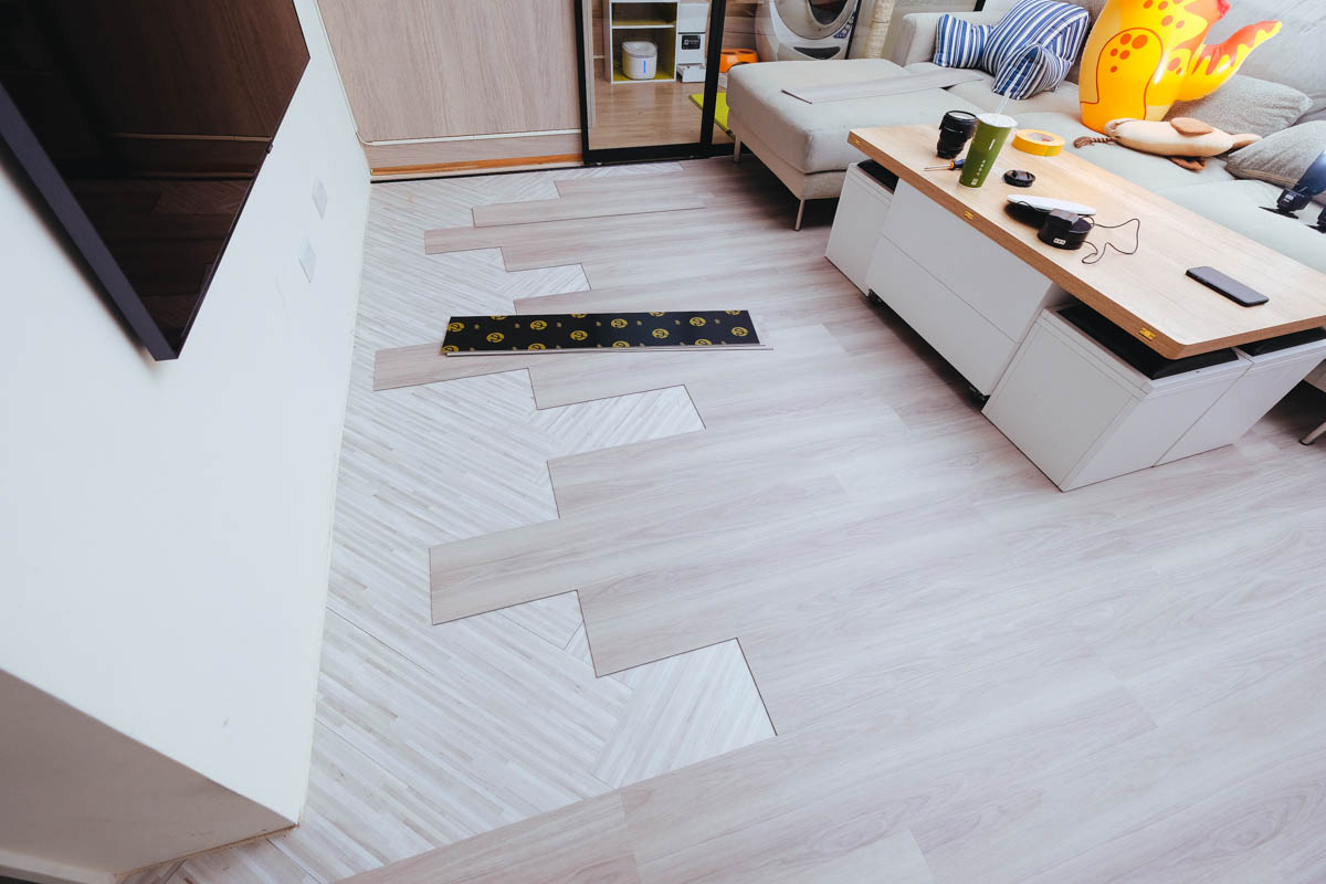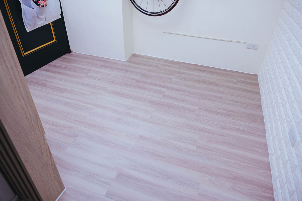 鋪設完後大家應該最關心的是 dHSHOP 的歐巴地板究竟好不好用?先講講鋪設心得,我之前也有自己用過要上膠的超耐磨地板,裁切的部份我個人覺得歐巴地板較為省力且好切一些,鋪設的時候只要確認每一片都有緊密的貼齊,基本上水也幾乎不會往下滲透,雖然阿湯花了八個半小時鋪設,不過扣掉記錄、拍照、吃飯以及嘗試拼法的話,其實 7.5 坪的空間含修邊應該只花了 5~6 小時左右就完成鋪設。