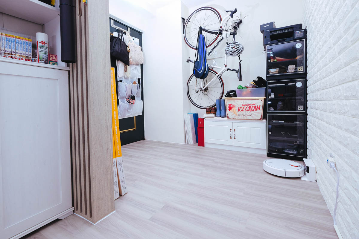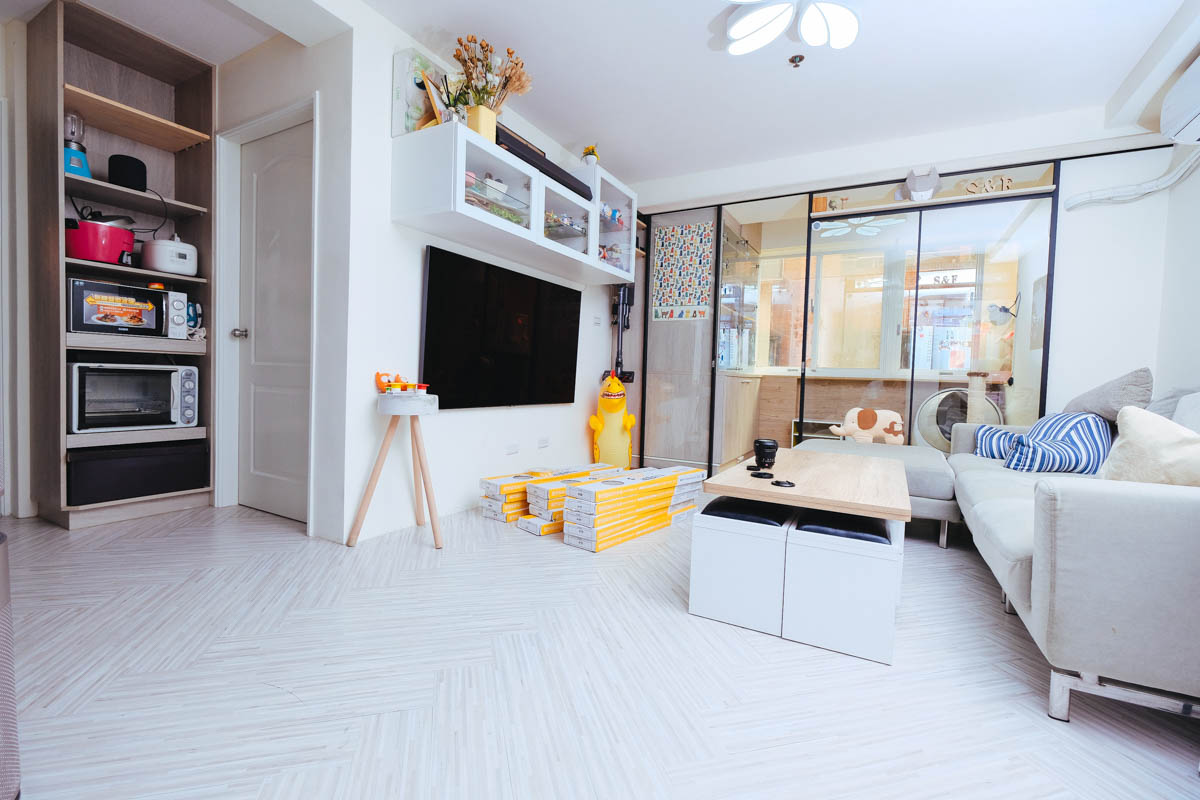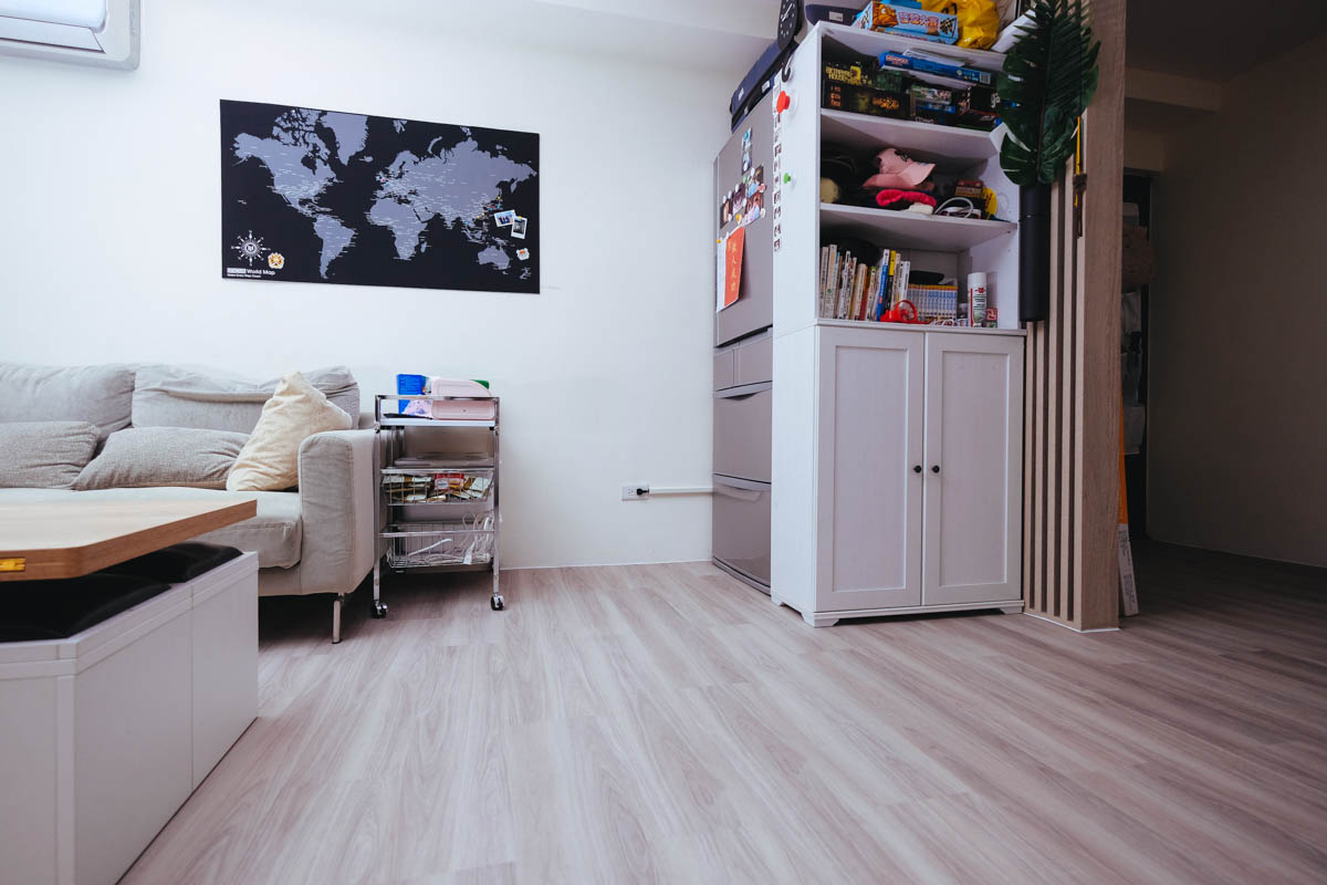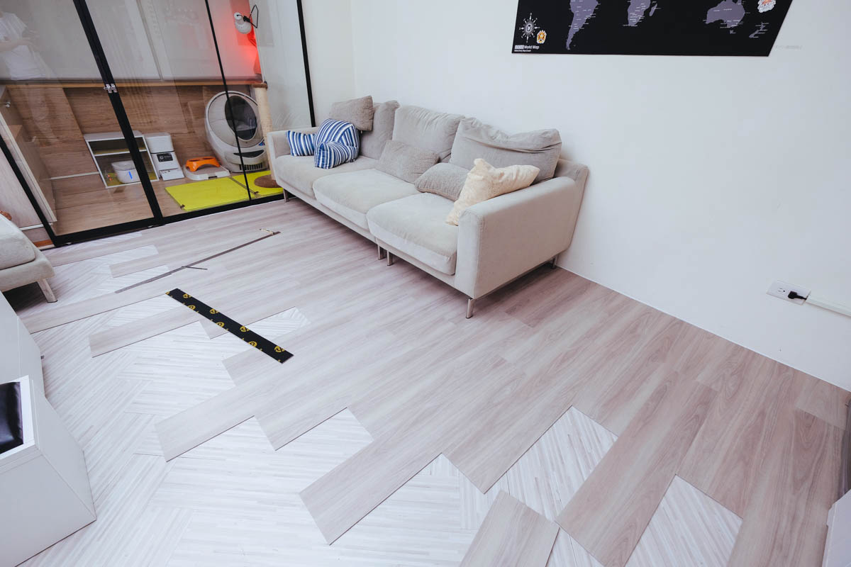 我們家是二房一廳,臥房因為還有床架,重鋪很麻煩,書房攝影工具太多,且湯包之後也不會爬到那(門會關著),所以最後決定就來處理以後湯包最會活動的客廳整個區域,大約是 7.5 坪左右。