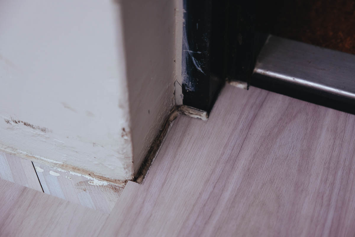 比較累的會像是這種轉角處,特別是遇到門框時,如果你跟阿湯一樣是走比較完美路線的就要多費點工了,整個客廳我鋪了八個半小時左右,大概有 7 成以上時間都在弄這種修邊,想要量測的很準的話,你可以按照轉角的距離量好後先在地板上畫線再裁切。
