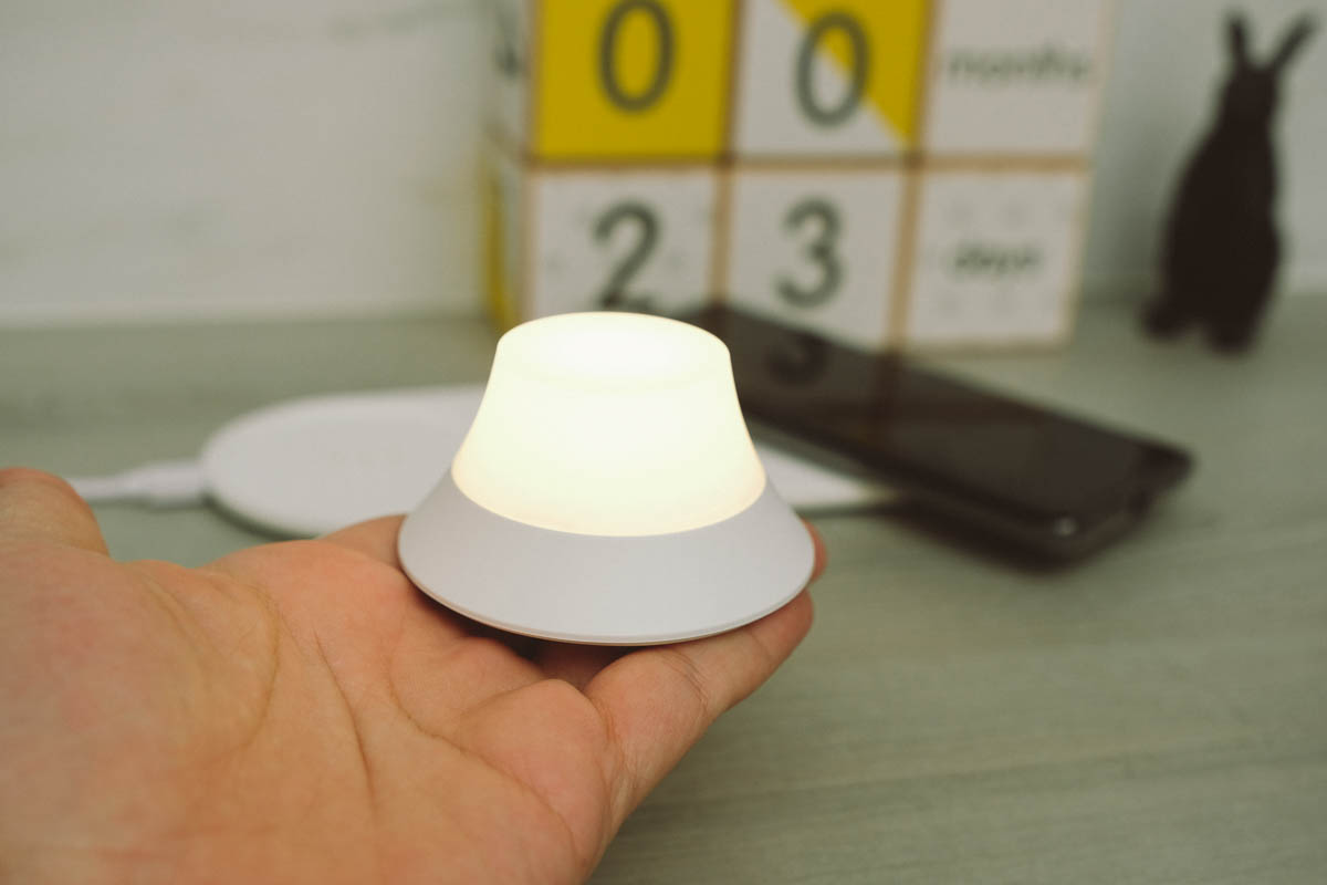 底座本身是無線充電板,充電位置在右邊的 Logo 上,而小夜燈的部份是可以分離的,充電則是採用磁吸式底座,平常如果晚上要上廁所看不到,也可以直接拿著小夜燈就走了。