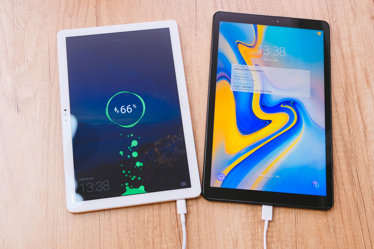 阿湯在家裡喜歡使用平板更勝於手機的另一個原因是「電量」,平板隨便都可以連續使用好幾小時,不論是看影片、玩遊戲,大概都只要等睡前再放著充電就好,如果真的使用量比較大的時候(像追劇一整天),充電速度就相當重要,二款平板都有支援快速充電,官方標榜的數據從 0~100% 充飽電 M5 lite 需要 2.9 小時,Tab A 10.5 則是 3.5 小時。