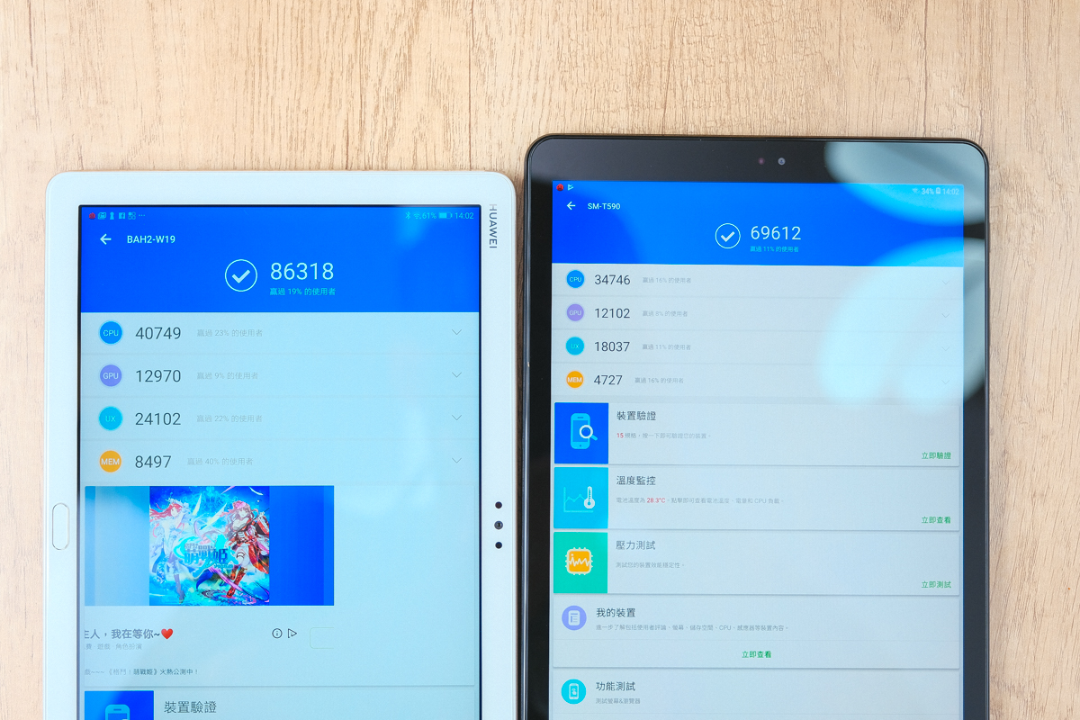 前面光列出處理器型號對於一般人來說,即便到網路上去 Google,大概也只看懂都是八核心,但不知道差異在哪,但我們透過安兔兔來進行測試,搭載 Kirin 659 的 M5 lite 分數為 86318,搭載 Snapdragon 450 的 Tab A 10.5 分數為 69612,差距約 1 萬 6 左右,阿湯大概解說一下,這分數雖然無法和現下旗艦級手機的 30 萬相比,但要說的是,當安兔兔分數大於 10 萬後,其實只差 1~2 萬分感受不出太大差異,但在 10 萬分內的機種,這 1 萬 6 算是有很大的差距,阿湯也認為 Tab A 10.5 的「原定價」來說,只用上 SnapDragon 450 確實稍稍可惜。