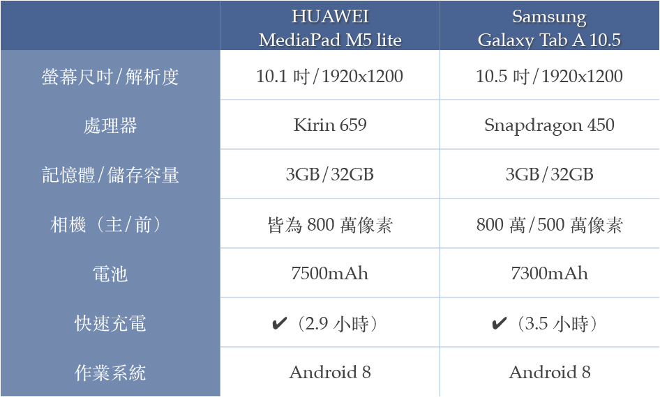 首先是基本的硬體規格,就數據來看,大家會比較有感受的應該是前鏡頭的像素,M5 lite 是 800 萬、Tab A 10.5 是 500 萬,最大差異絕對不會是用在自拍,而是和家人朋友視訊,畫質會略有差異(當然還得看你的網路速度及穩定度),其他則是在快速充電的部份從 0% -> 100%,二者的快充差異 0.6 小時,不過 M5 lite 的電量比 Tab A 10.5 多了 200mAh,實際算起來應該是會再多差異些許時間,光看規格 M5 lite 的快充是比較快的。