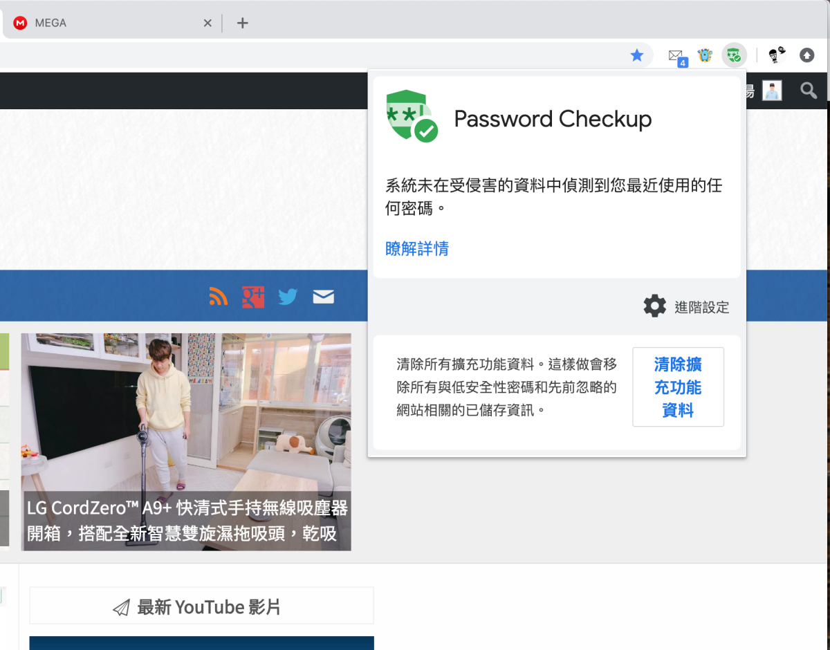 安裝完後不需要做任何設定,會在右上角顯示一個盾牌的圖示,只要你一直看到綠色的就代表沒問題,至於帳密是用什麼方式檢查呢?Google 的說明中是提到會用安全的加密方式進行檢查,檢查過的資料都會儲存在你的本機上,並不會有任何外洩的問題,每一陣子你也可以透過清除擴充功能資料的這個按鍵,將檢查過的資料清除。