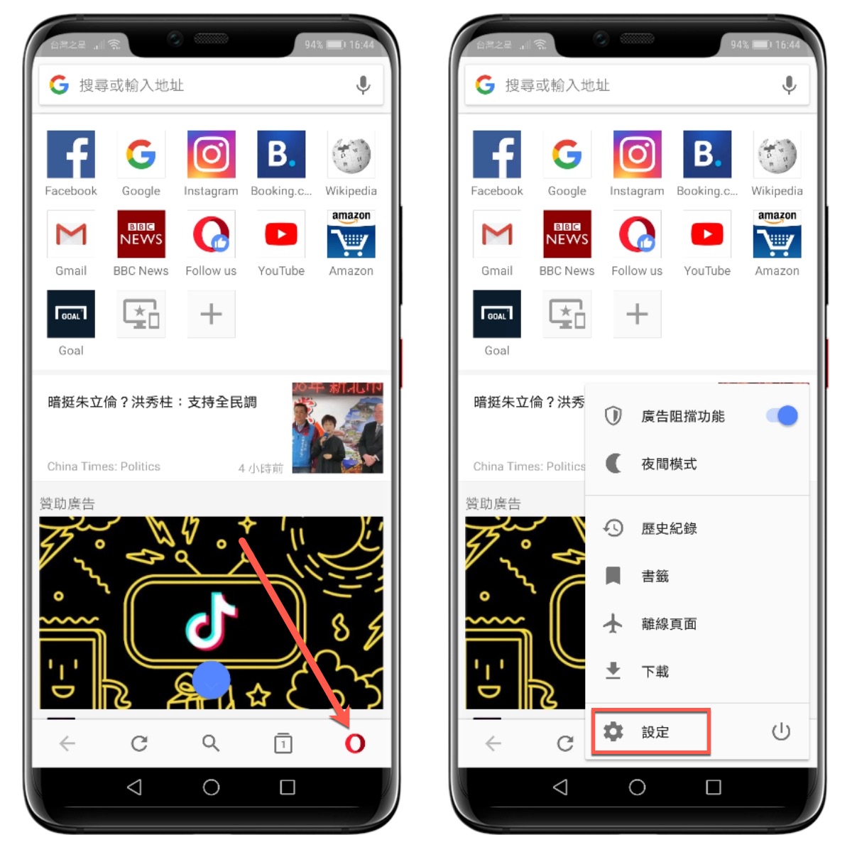Opera 瀏覽器右下角有個紅色的 O 圖示,點擊後再進入設定。