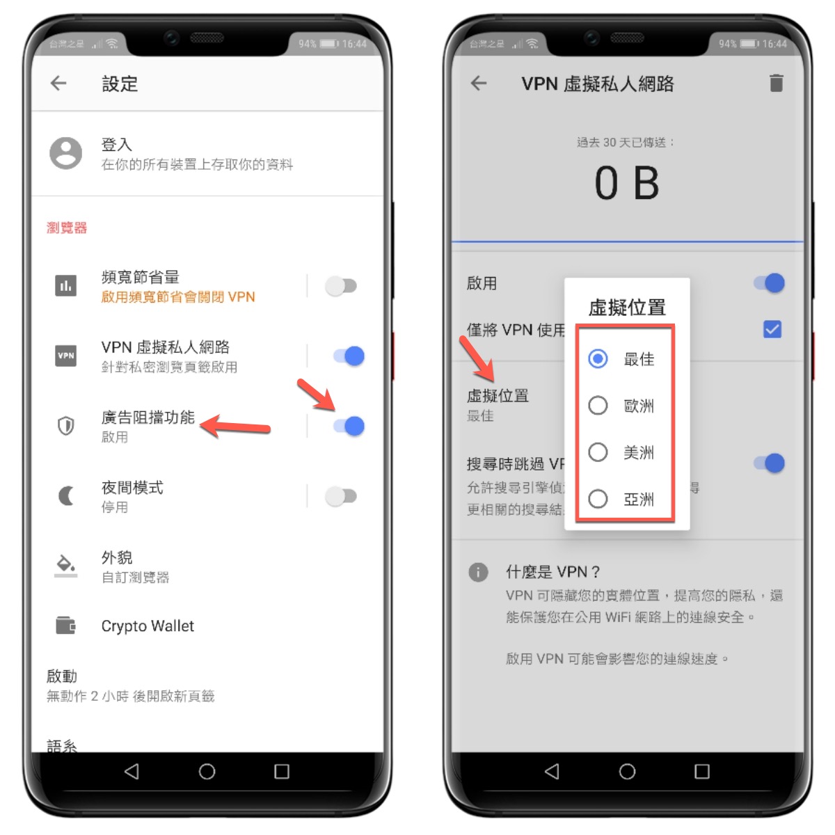就會看到有個「VPN 虛擬私人網路」,將他打開後再點擊進入,如果想要選擇位置的話,就可以在「虛擬位置」那自行選擇歐洲、亞洲或美洲的位置,依需求來使用就可以囉,不過未來 Opera 會不會將這功能放到正式版上就不得而知,目前也僅在 Android 版的 Opera beta 網頁瀏覽器上開放,用的到的人趁現在趕緊用吧。