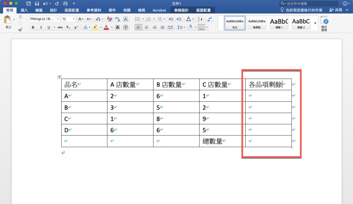 如果你設計了這樣的表格,一定會想像 Excel 表格一樣,當我修改了前面數量時,後面加總的地方可以自動計算,不用手動填寫,可能有人會問為什麼不乾脆用 Excel 做就好?因為這表格可能只是一整份資料的其中一小塊,所以才會用 Word 來做,Excel 並不適合用來做一整份的綜合資料內容。