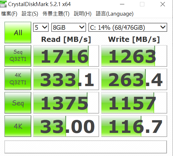這次在 ZenBook Pro 14 上所搭載的 SSD 採用的是 NVME PCI-E x 2 Gen3 高速固態硬碟,透過 CrystalDiskMark 所測試的數據,讀取可以達到 1,700 MB/s 以上,有著非常好的讀寫水準。