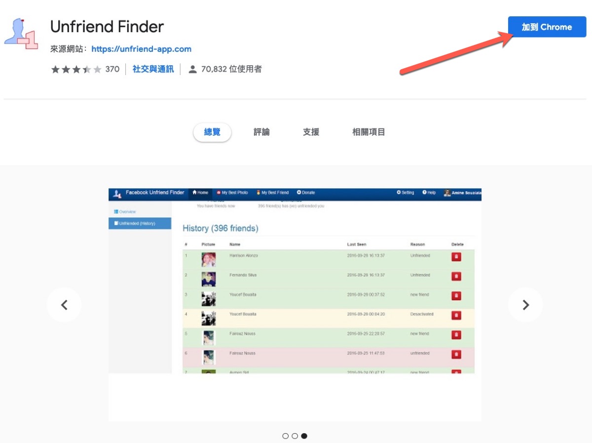 首先開啟 Google Chrome 瀏覽器,進入 Unfriend Finder 的套件網址後,點擊加到 Chrome。