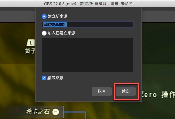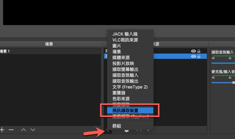 首先打開 OBS 後,要先設定遊戲畫面出來,在下方的來源中,按下 + 新增「視訊擷取裝置」。