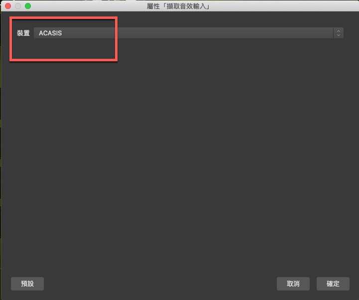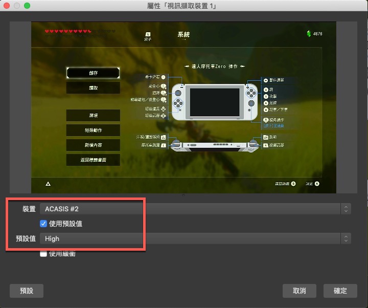 然後在裝置的部份選擇你購買的擷取器,阿湯的是 ACASIS。預設值是選解析度,High 的話就會是 1080p 60fps。