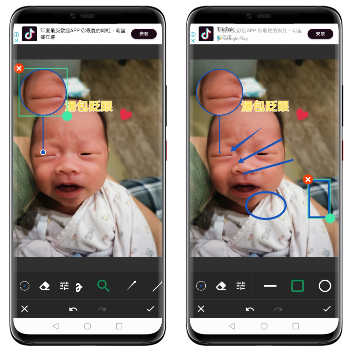 大家最需要的標註功能就是放大鏡、箭頭及線框,在這款 APP 通通都有內建,這些框線都可以選擇顏色,雖然 APP 有廣告,但不干擾到功能使用,而且 APP 也是免費提供,算是佛心來著了。