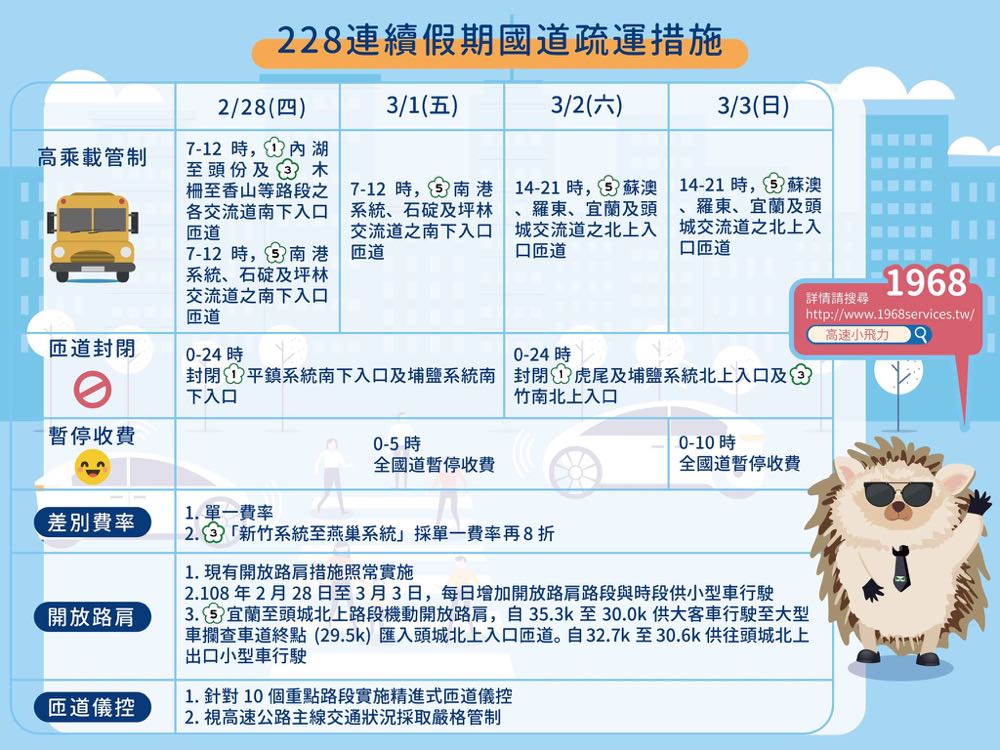 根據公路局提供的資料,這次 228 連假高速公路共有「高乘載管制」、「匝道封閉」和「暫停收費」三項措施。