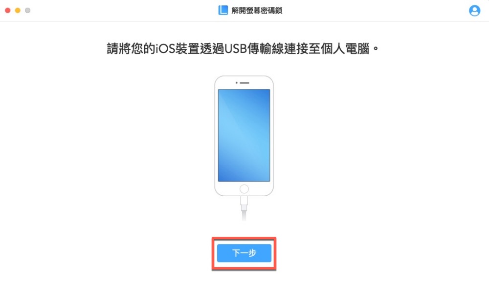 將你的 iPhone 或 iPad 接上電腦後,開啟軟體,選擇解開螢幕密碼鎖後按下開始。