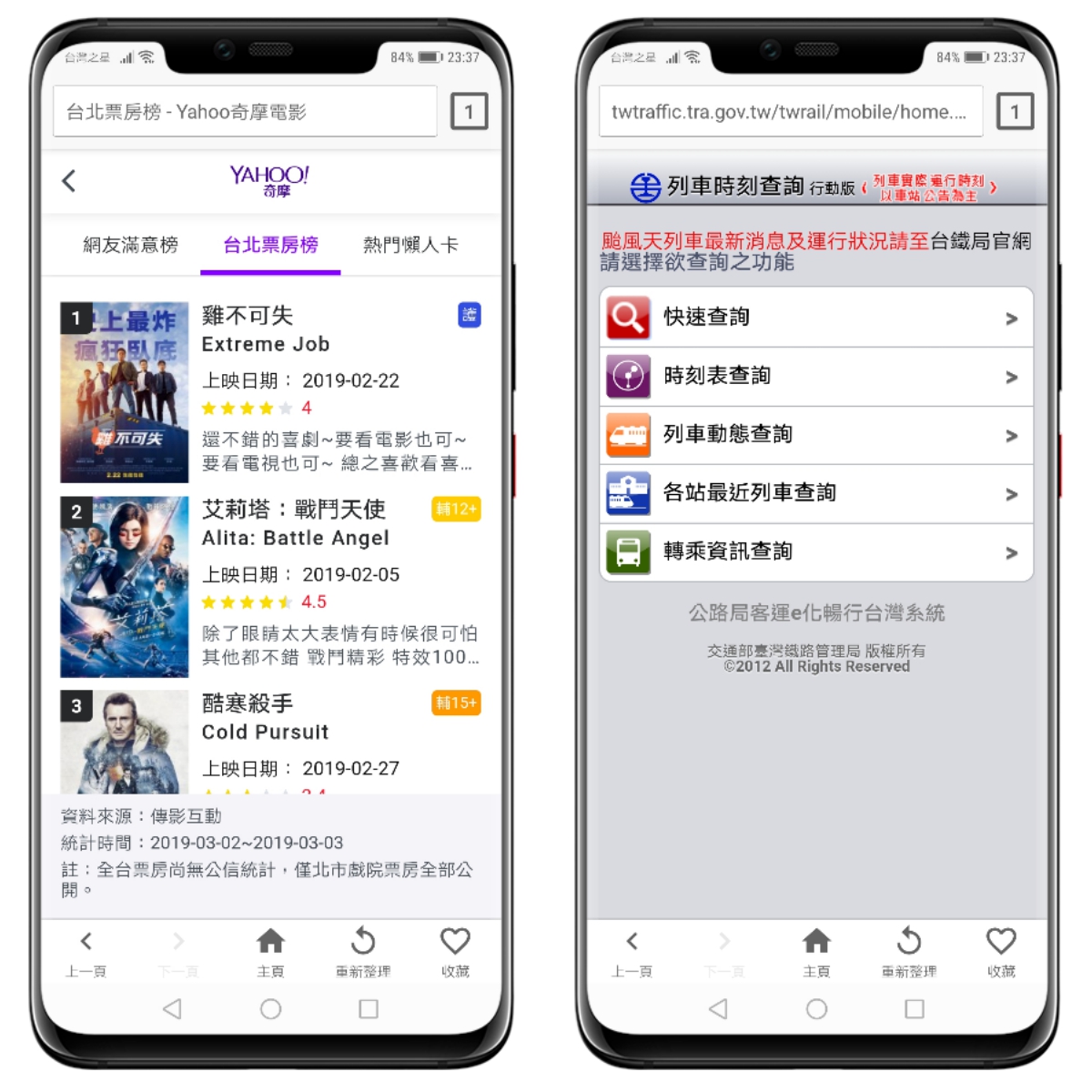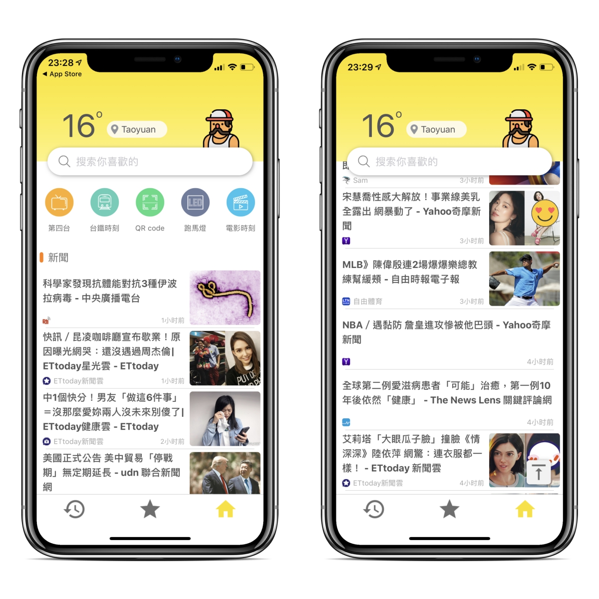 首頁上方有一些實用的工具,像是新聞第四台、台鐵時刻查詢及訂票、QR Code、跑馬燈跟電影資訊,而下方則是整理了一些熱門的新聞(可以一直往下滑個不停)。