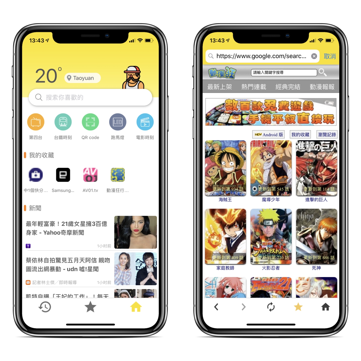 而這老司機瀏覽器最實用的應該就是收藏功能,大家可以透過上方的搜尋框輸入網址或者關鍵字搜尋你要收藏的網站,然後在下方按下星號,就會加到收藏,在 APP 首頁一進入就可以看到你的收藏網站,點擊馬上就可以瀏覽。