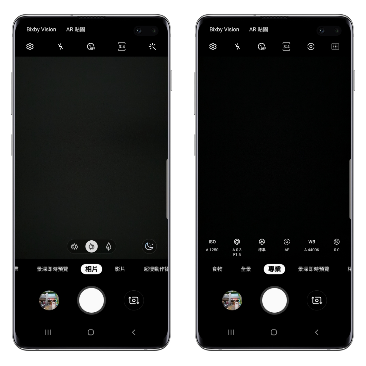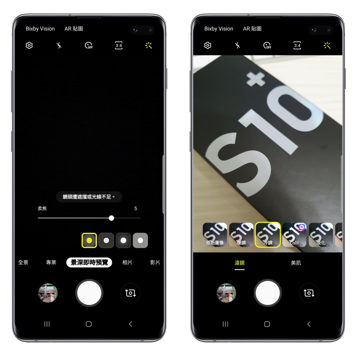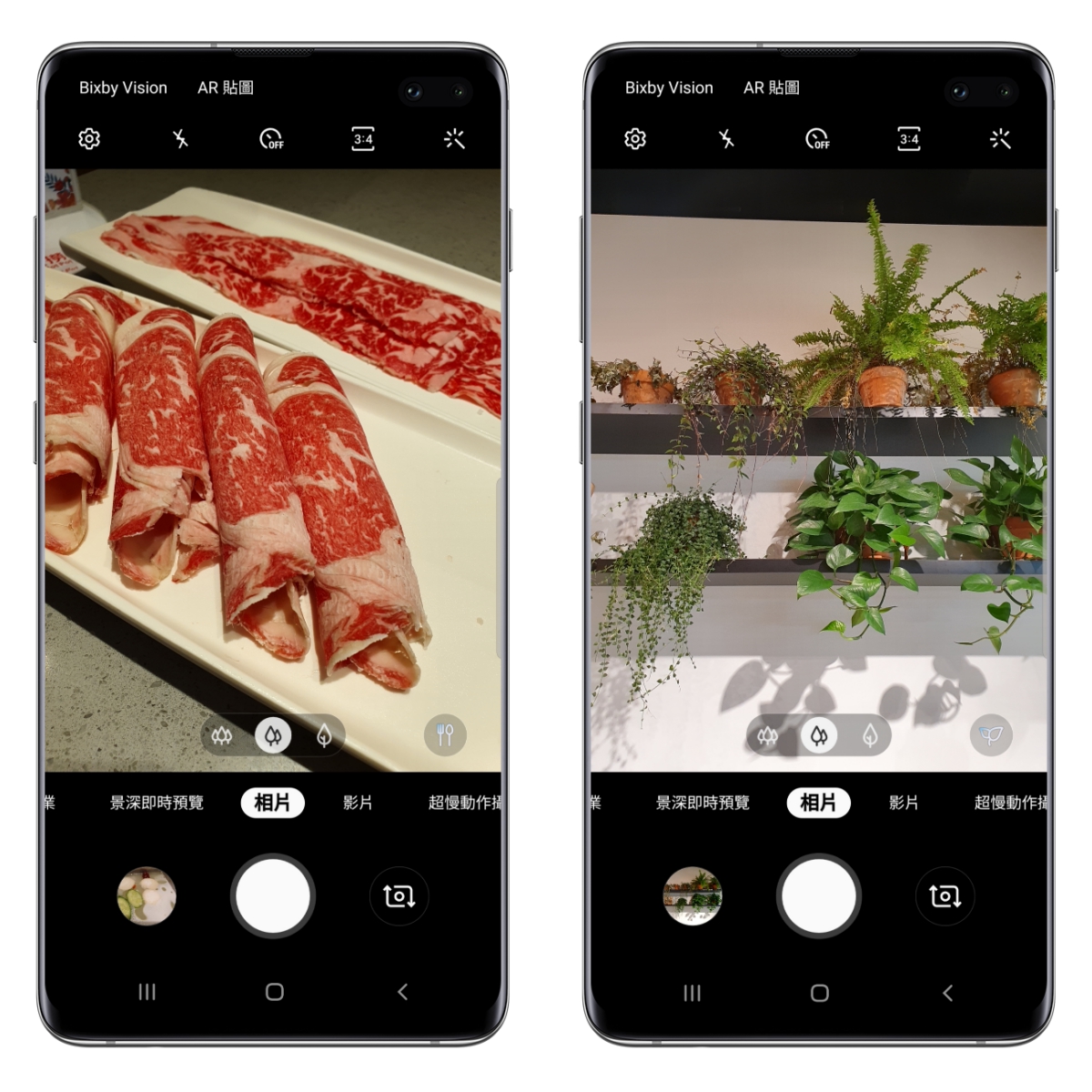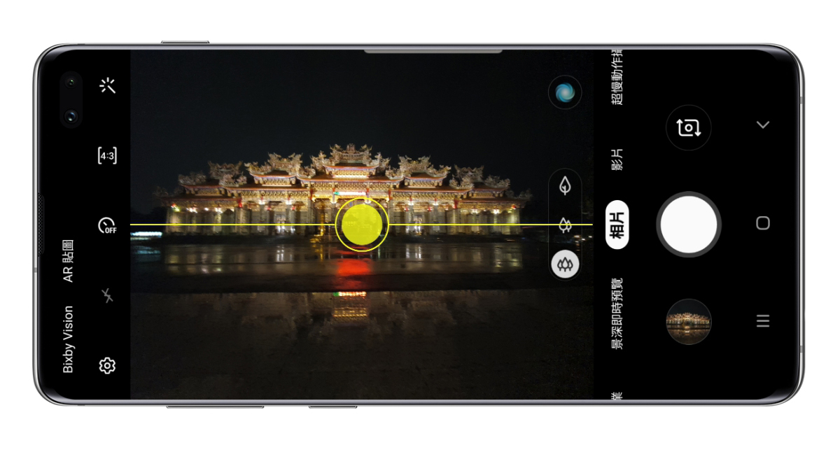 Galaxy S10+ 在這十週年的日子裡,外型有感升級外,相機的部份也超有感升級,前後共五鏡頭帶來的攝影體驗真的不是蓋的,不論是成像、顯示色或是功能比起前一代 S9+ 都有顯著的差異,阿湯覺得特別是錄影防手震真的是超穩,慢慢的來和大家分享。 首先是主鏡頭的三鏡頭,其中包括有智慧雙光圈的主鏡頭、二倍長焦鏡頭以及一顆全新加入的 123 度超廣角鏡頭,在中間下方就以圖示來代表,直接就可以切換不同焦段來使用。 而主相機的功能包括自動模式、景深、專業、全景、食物,另有錄影模式、超慢動作攝影、慢動作以及縮時攝影,在最左上方還包括有 Bixby Vision 以及 AR 貼圖二個功能,大家別漏掉囉。