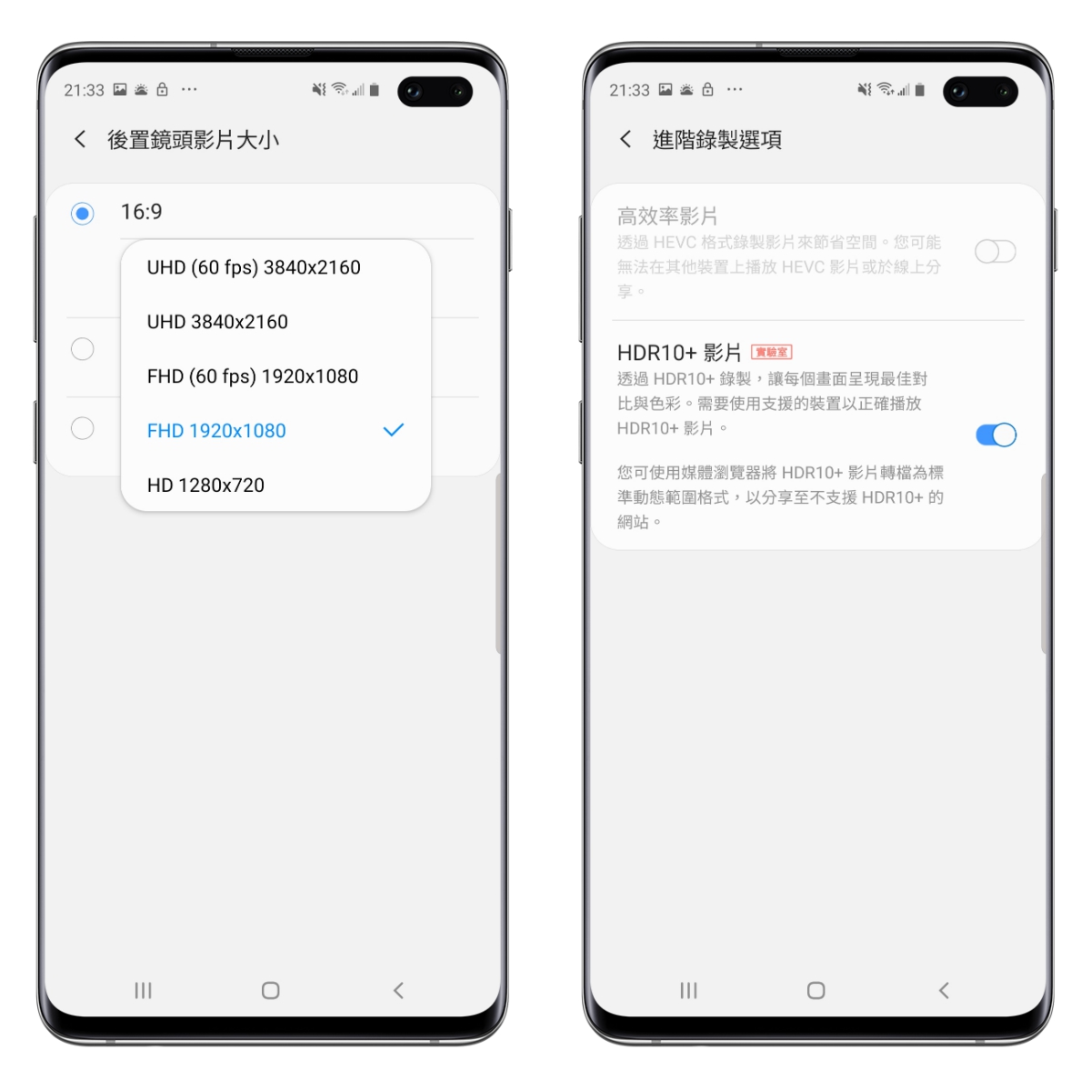 錄影的部份除了防手震非常有感之外,4K 影片可以錄製 60fps,不過要注意的是,如果想要開啟防手震以及 HDR10+ 錄製功能的話,最高解析度只能選擇 FHD 1920x1080 這一個,不過防手震真的比起很高解析度來的重要啊。
