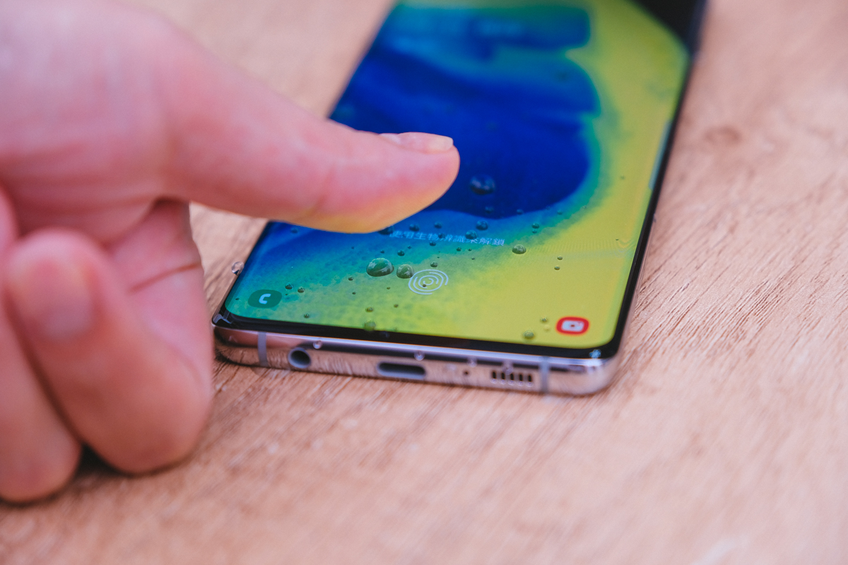 而這超聲波指紋辨識技術,即便手上有沾上水或油污,也完全不影響辨識的精準與速度,阿湯也實測了在螢幕上灑水後,手也沾濕進行解鎖,完全不受影響。