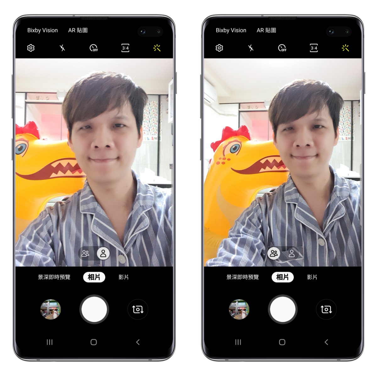 而前置鏡頭可以選擇個人自拍或多人自拍模式,差在拍攝出來的廣度,阿湯用同樣的距離截圖給大家看一下,大概差了有 1.5 倍左右吧。