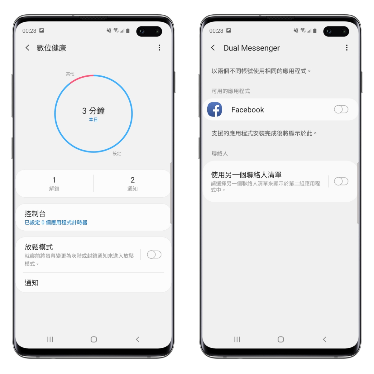 數位健康應該也是從 Samsung One UI 後才有的功能(阿湯沒印象先前有看過),這個是一個很有趣的功能,除了計算你打開手機的時間之外,還可以看你解鎖了幾次,共有幾則通知,還能針對應用程式進行計時,就可以了解一整天下來究竟你拿起手機做了哪些事,每個 APP 開了多久。