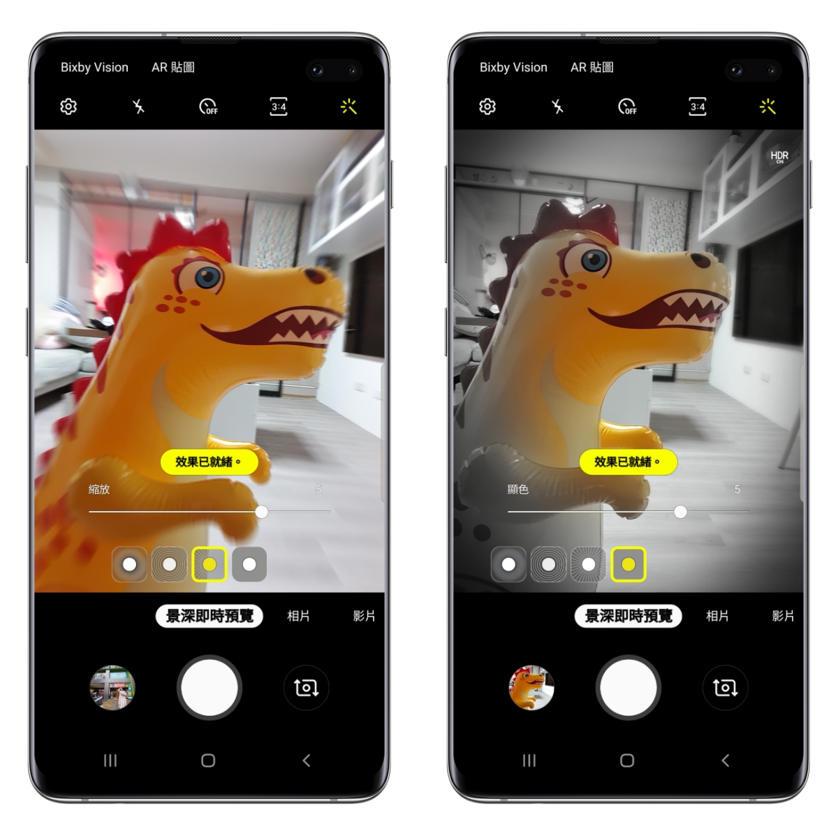 拍照效果來說,主要有景深模式及右上角的濾鏡功能(包括色調以及美肌),景深模式這次特別加入了四種模式可以選擇,可以讓你的景深有不同的變化,往下來看一下效果。