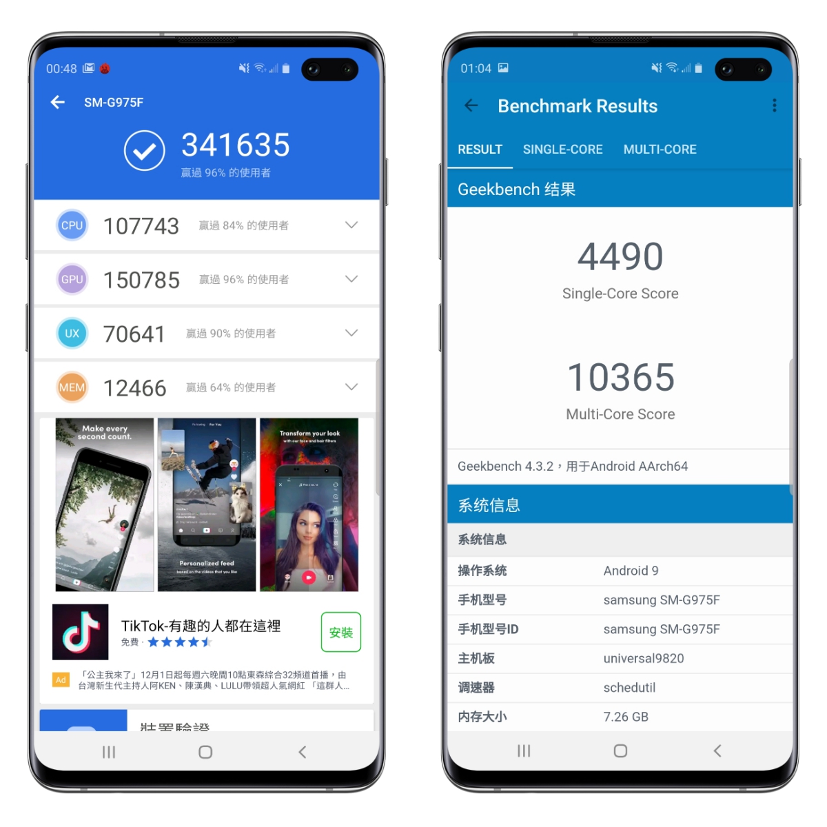 這次採用最新的 Exynos 9820 處理器,當然效能也是不容小覷,安兔兔的跑分測試下獲得 34 萬以上的高分。 另外在 Benchmark 下,單核分數為 4,490,多核為 10,365,已經破萬了。