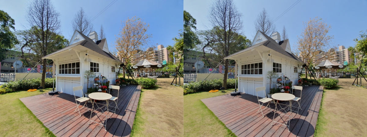 建築物的大景也很有差異,左圖是有開 AI 所拍攝,右圖關閉,可以看的出來有開 AI 場景智慧辨識的色彩比較飽和且更加討喜(應該不用特別再修圖)。