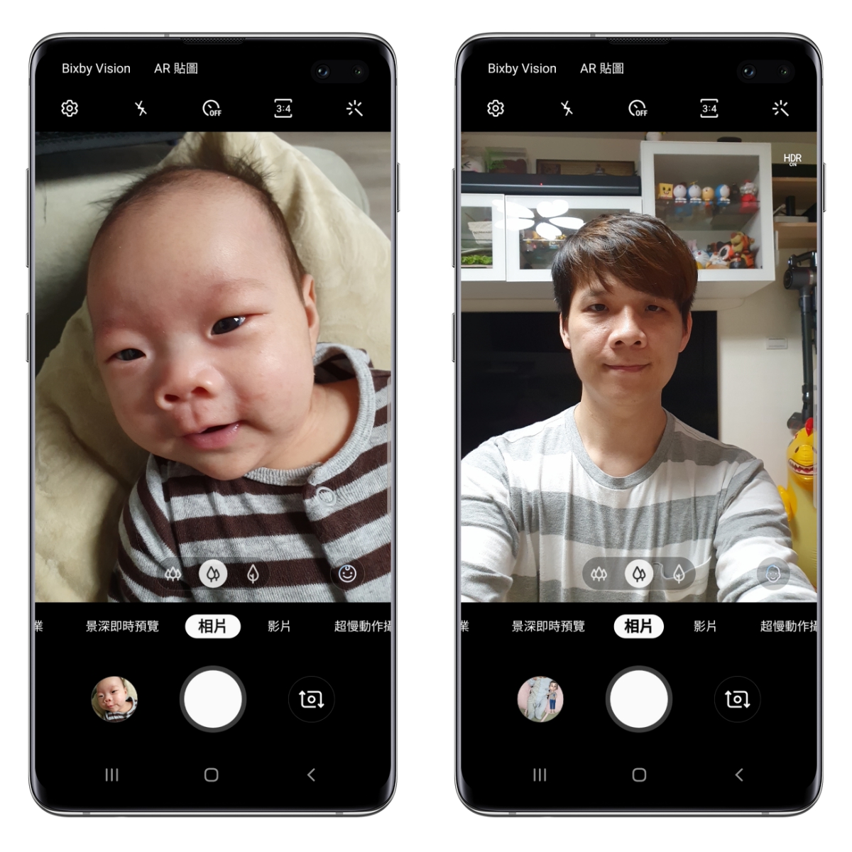 前置鏡頭的部份在 Galaxy S10+ 上搭載了一顆 1000 萬像素、光圈 F1.9 的鏡頭之外,並搭配一顆 800 萬像素的 RGB 景深相機,讓我們在自拍的景深模式下,能夠拍出更自然景深感的照片。