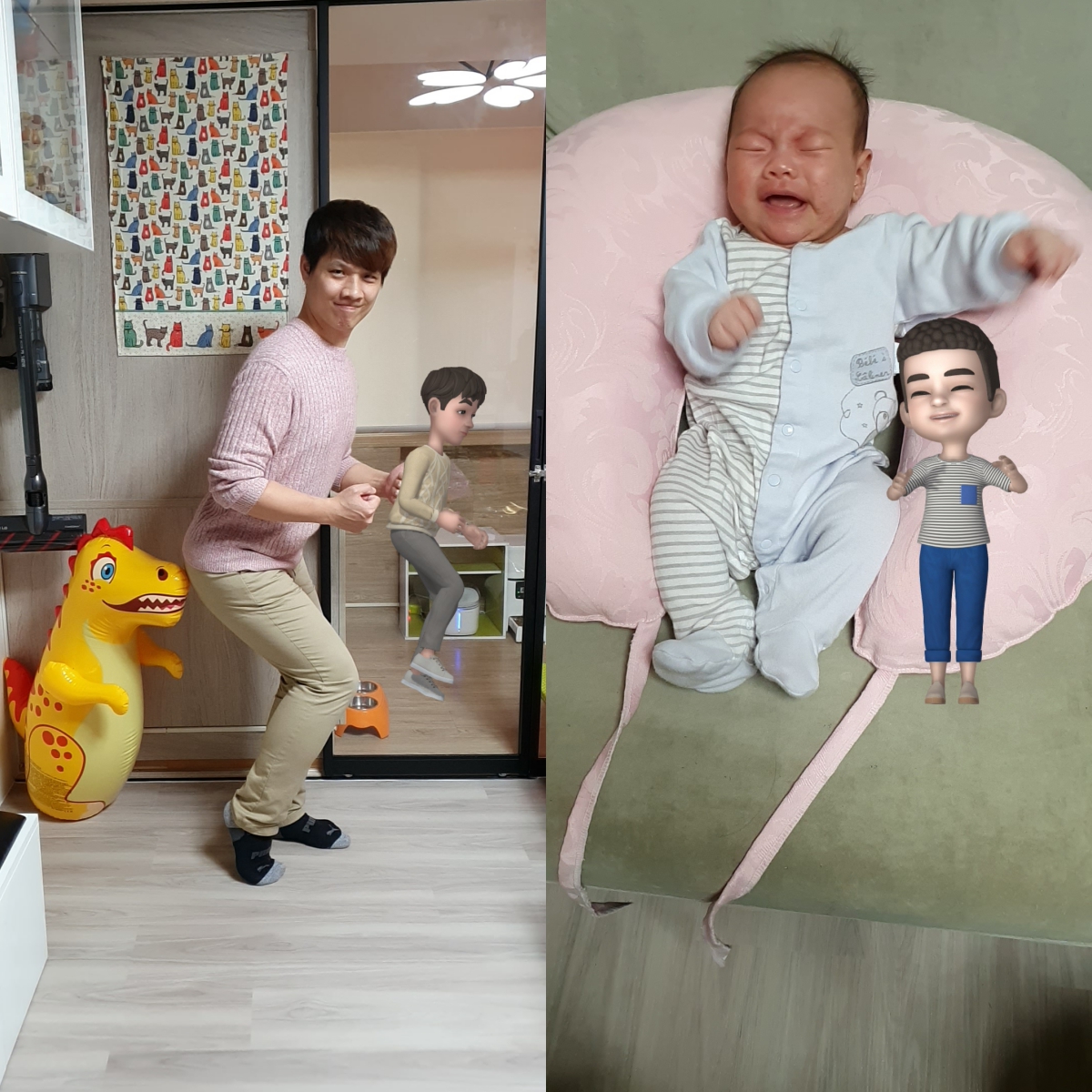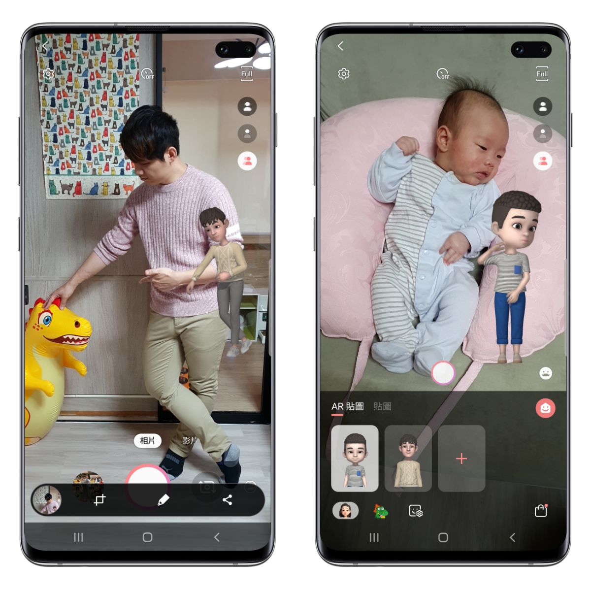 最好玩的應該是「細微動作」這個功能,這是用來拍攝全身使用的,可以依據你做出來的動作在你的身邊顯示你的 AR 人偶,而且做同一個動作,超可愛,特別是也有兒童 AR 人偶可以創建,立馬就幫我兒建立了一個,超可愛的。