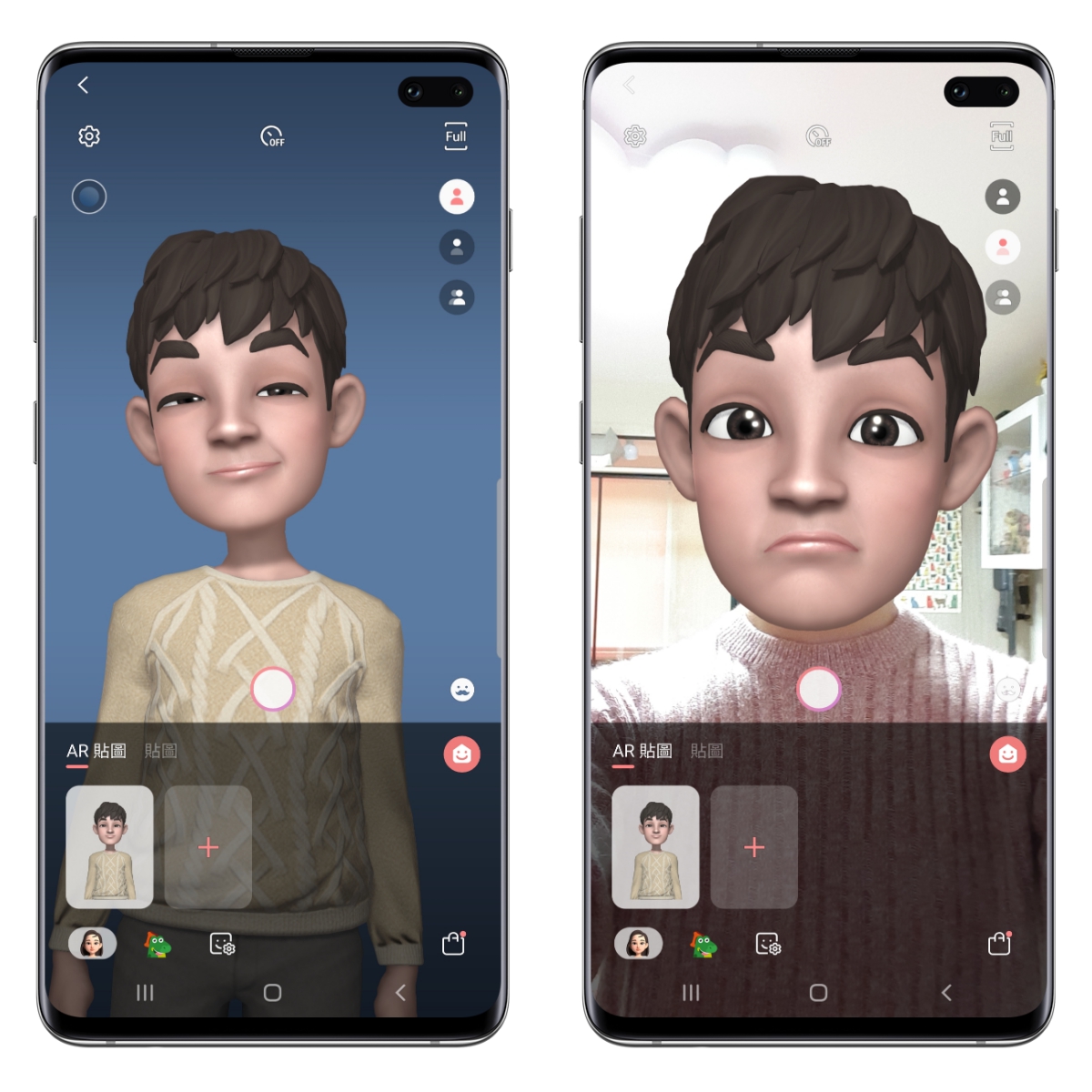 這次的 AR 人像運用,除了最基本的創建自己的 AR 人偶之外,這次還可以使用「面具功能」,只取代掉你的頭像部份,會看起來很有趣,因為頭很大,身體很小。