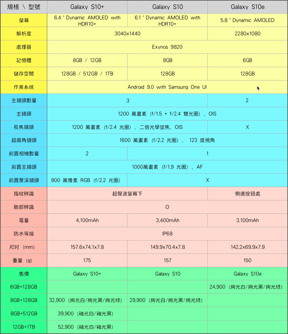 先提供大家 Samsung Galaxy S10 系列的各型號基本規格,讓大家在選擇時能夠一目瞭然,知道自己需求會是哪一個型號。