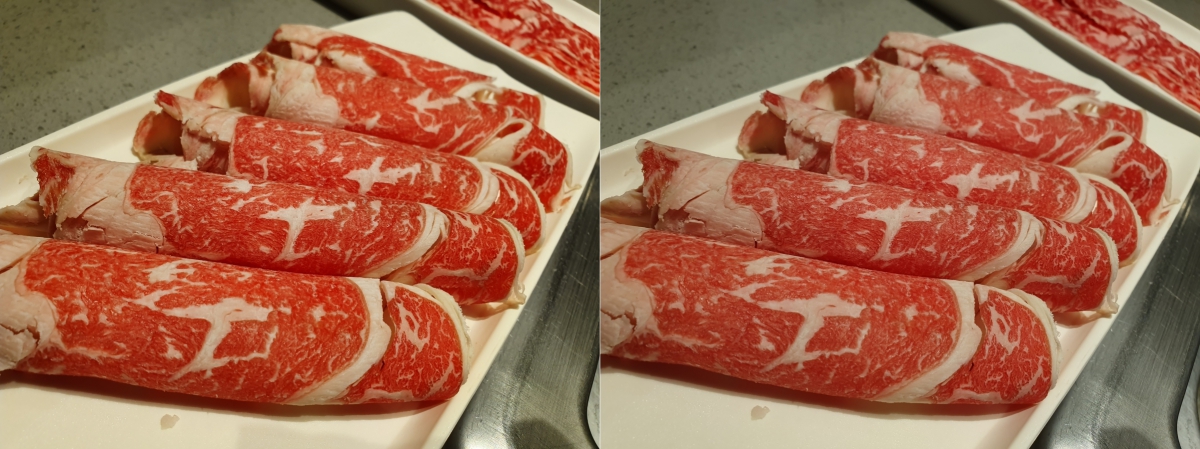 有沒有開 AI 場景智慧辨識差很多嗎?其實蠻明確的,以這張肉來說,左圖是有開 AI 所拍攝,右圖關閉,可以明顯的看出左圖的肉品色彩較鮮艷,畫面看起來更銳利一些,食物大致上也是需要顏色飽和一些,看起來會更好吃。