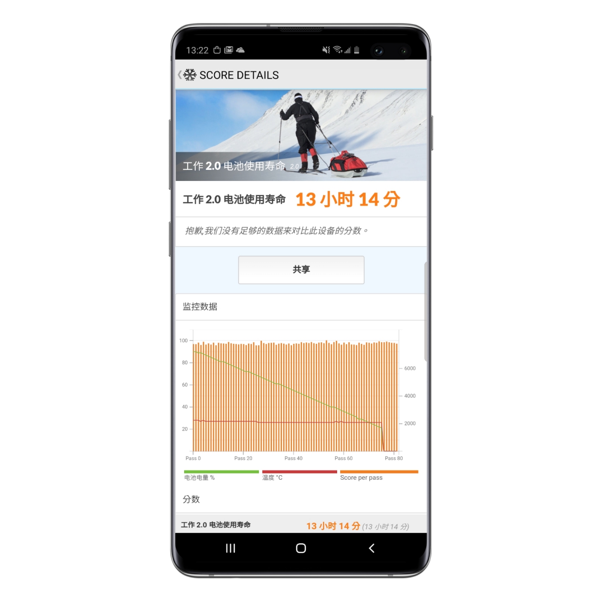 至於續航測試,搭載有 4,100mAh 電量的 Galaxy S10+ 獲得了 13 小時 14 分的續航時間,這是在螢幕解析度設定為 FHD+ 所測得的,提供給大家做為參考。