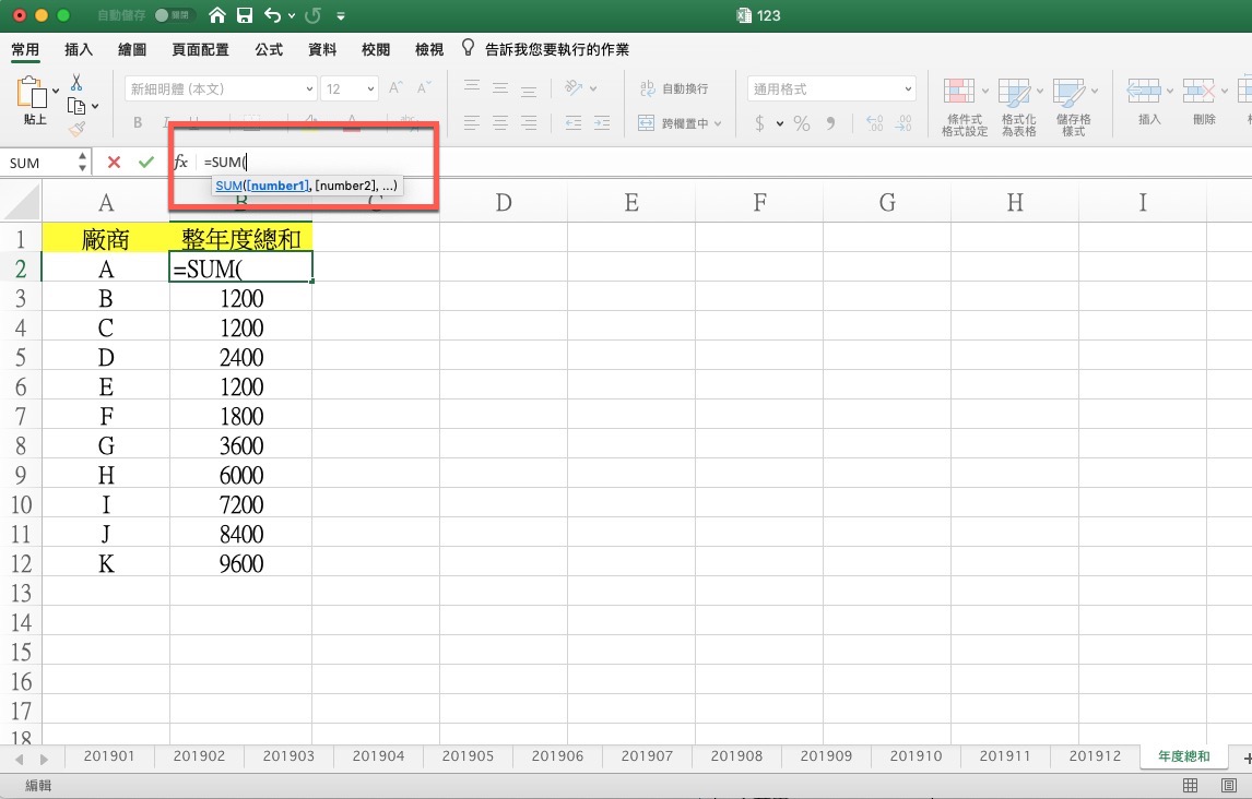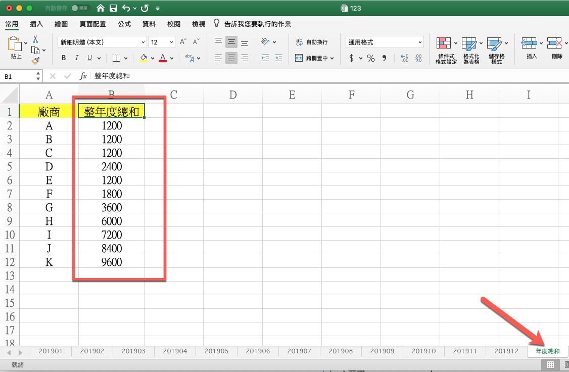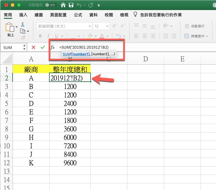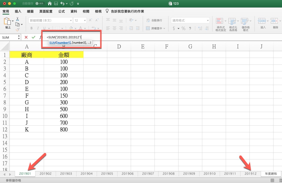 之後,就可以按一下第一個工作表 201901,然後按住 Shift 後再點擊最後一個 201912,這樣就會看到公式變為