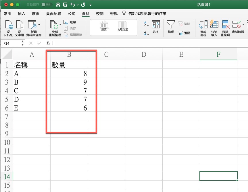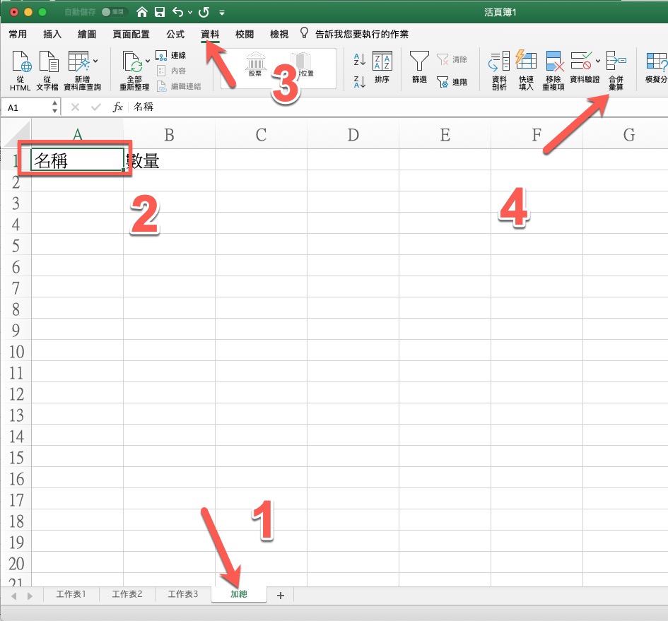 首先在加總的那個工作表先打好最上方的標題,比如名稱跟數量,然後按一下名稱的位置,選擇上方的資料,再選擇我們這次要使用的功能叫做「合併彙算」。
