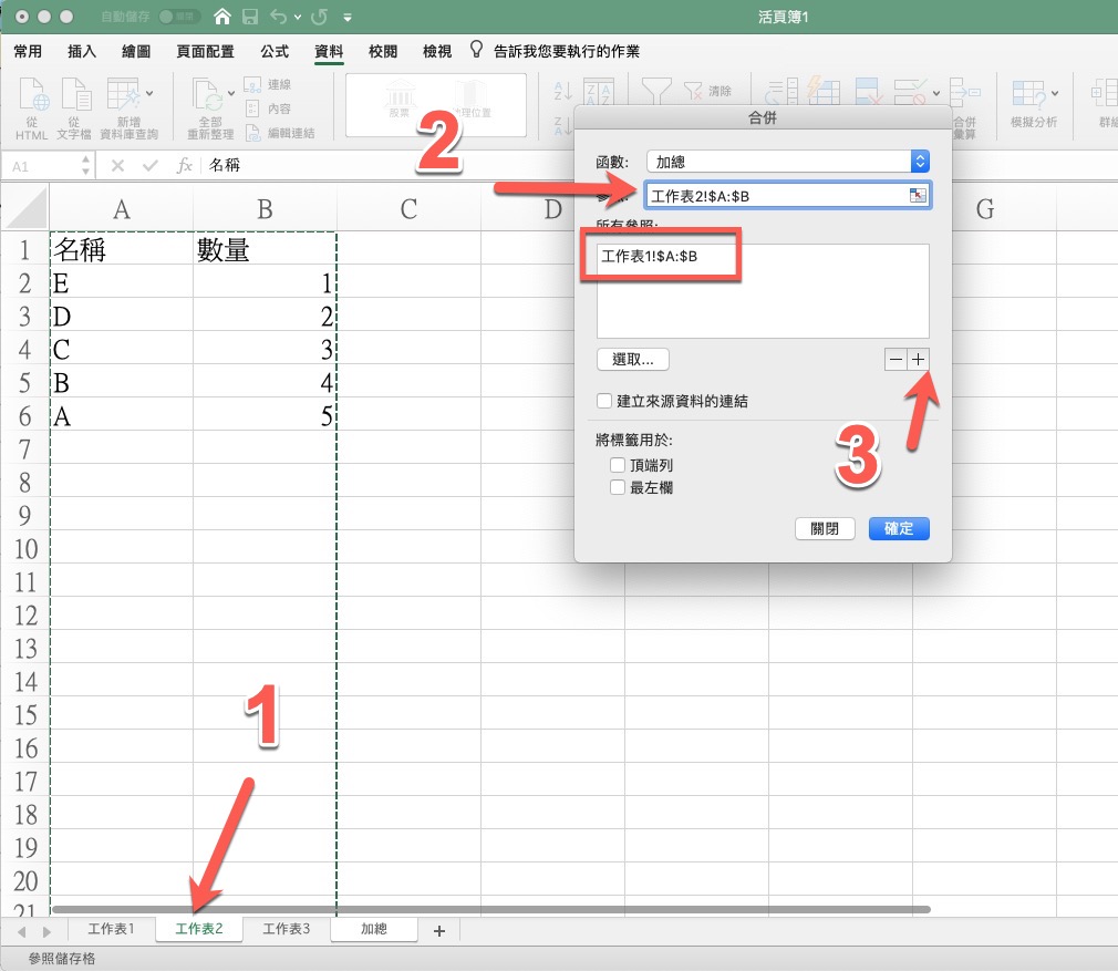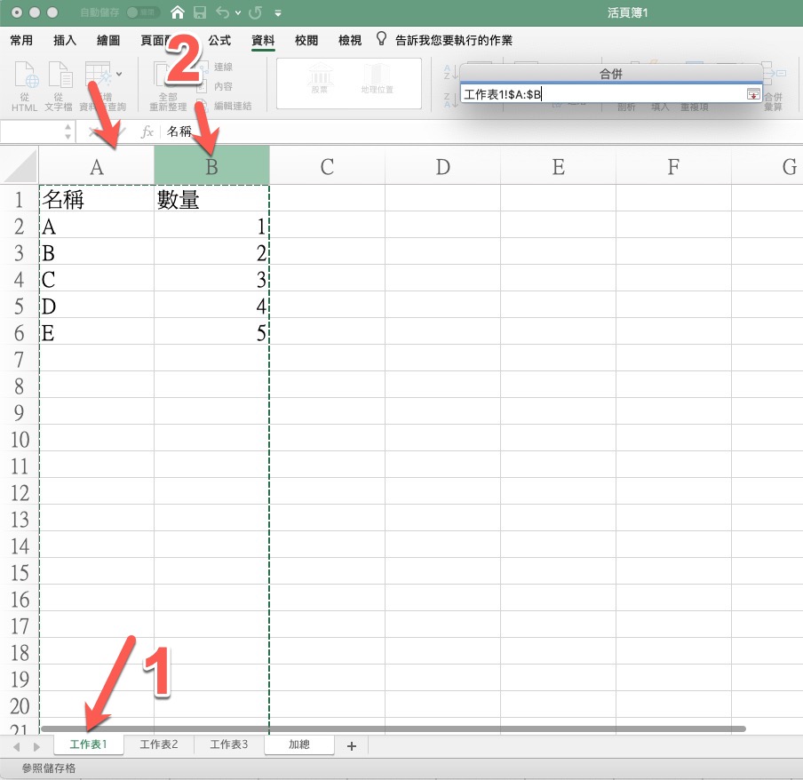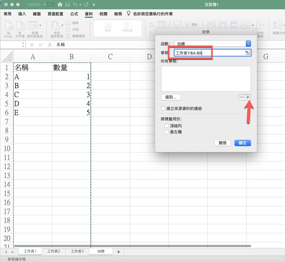 這時會看到工作表1 的範圍已經進到參照裡,接下來你直接在這畫再點下方的第二個工作表,你會看到參數欄已經自動變成工作表2 的同樣 A 跟 B 列全選,再按下 + 就乭以再加到參照。