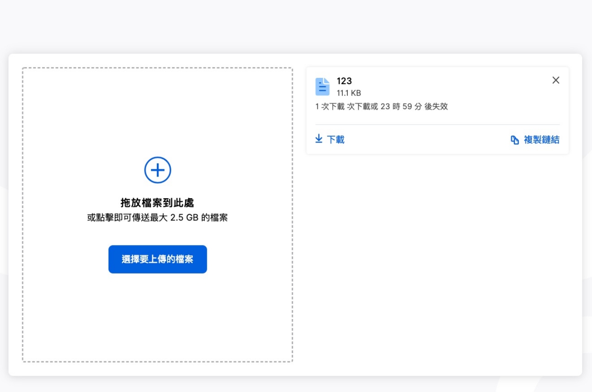 另外,在不註冊的情況下,單檔 1GB,時效預設會是 24 小時,並且僅能下載一次,當朋友一下載完就立即失效(很適合我)。