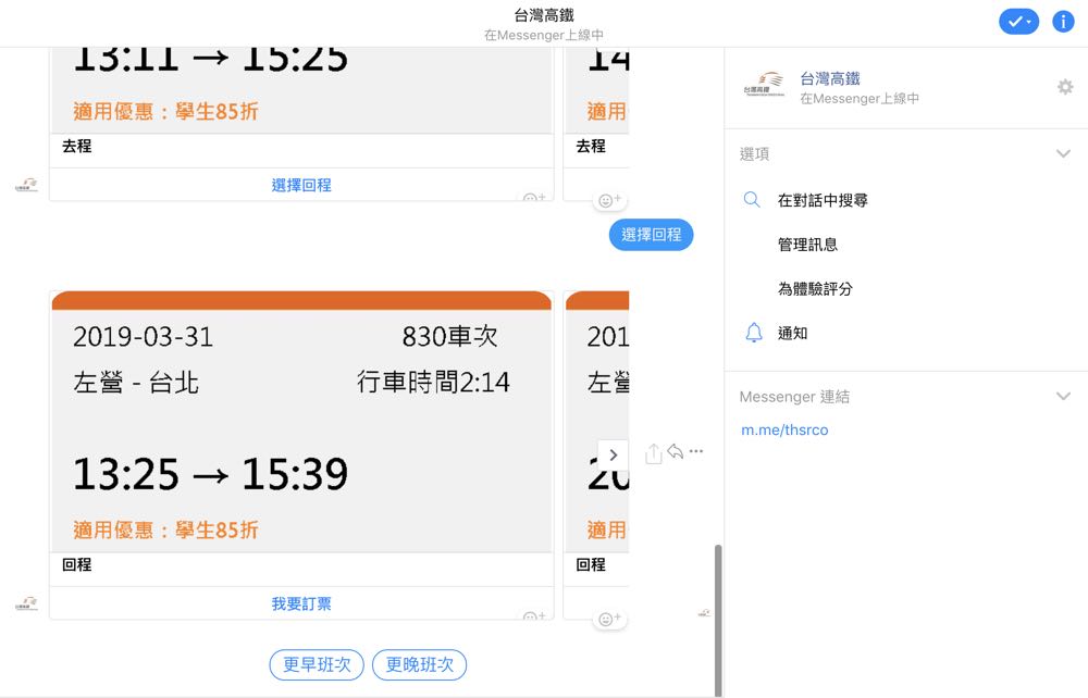 在每一個步驟中,操作介面都相當的直覺明瞭,更有許多像是要更改時間、選更早的班次... 等進階選擇讓我們使用,如果沒有安裝 app 的朋友,Facebook Messenger 的訂票選項,似乎真的讓訂票變的更方便了耶!