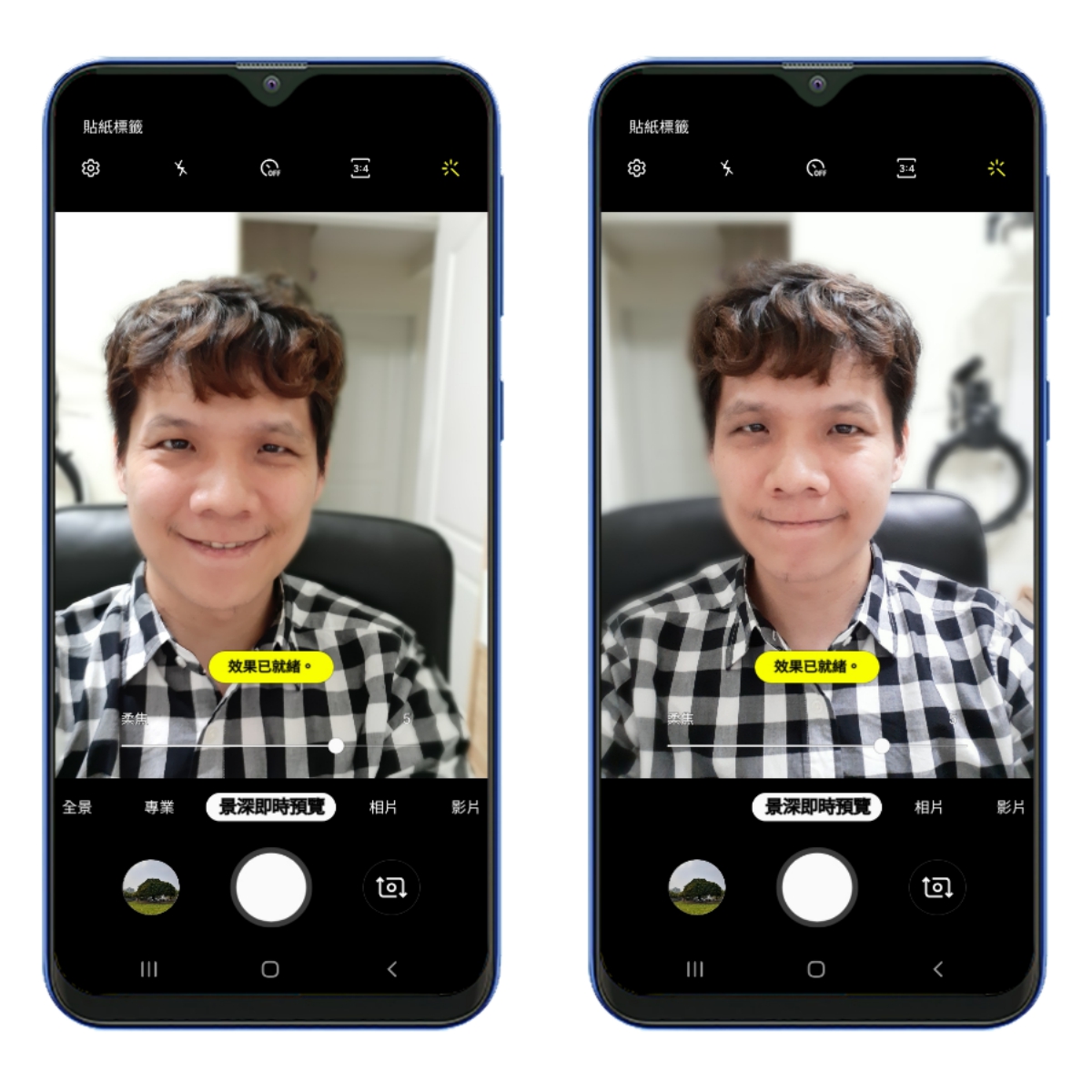 雖說是平價入門級,但景深的運算處理上還是有不錯的效果,且景深模式下還有柔焦美顏功能,光這二張拍攝人像就有很明顯的差異,右邊的阿湯看起來年輕五歲了啊...
