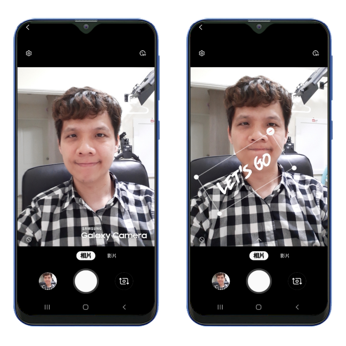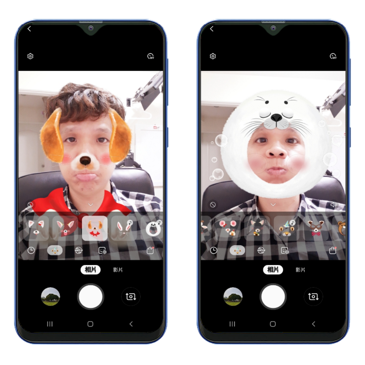 另外在有趣的貼圖功能部份,Galaxy A20 及 A30 都支援 AR 貼圖照相,但如果你想要玩 AR 虛擬人偶,那麼 Galaxy A30 以上才有支援哦。