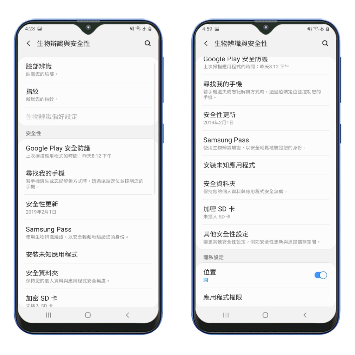 安全性的部份支援臉部辨識以及指紋辨識可以使用,並支援安全資料夾,可以將較有個人隱私的檔案或照片放到安全資料夾中避免被別人隨意開啟閱覽,而安全資料夾也能將應用程式放入,往下來看。