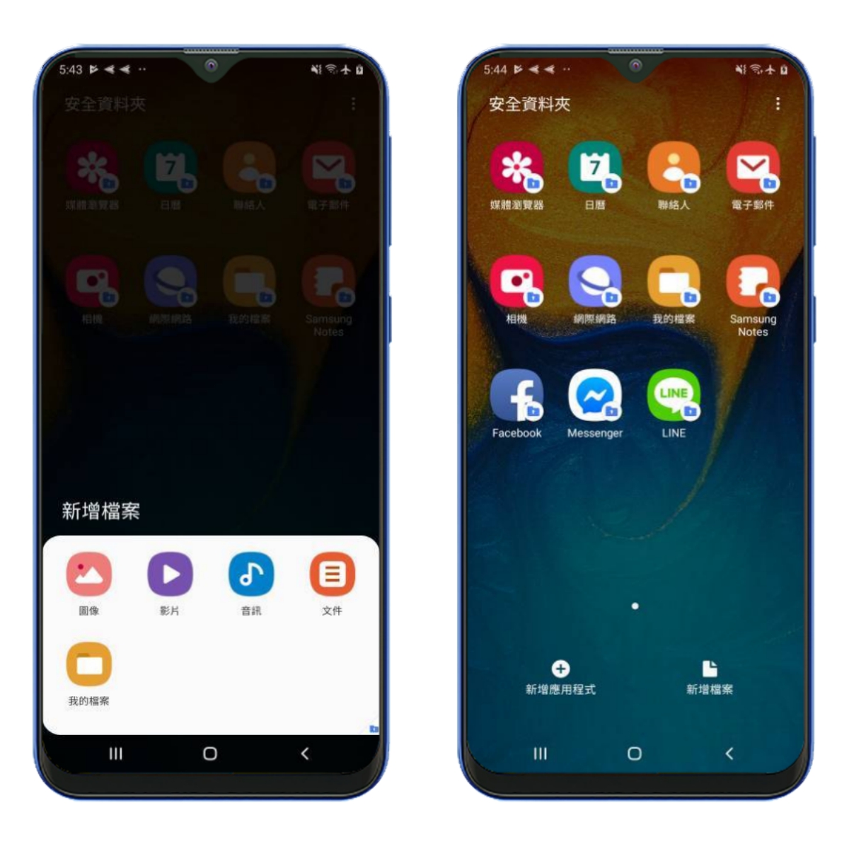 安全資料夾你可以將檔案放置進來,也可以將 APP 放置進來,以社群類 APP 來說,放置進來後,就會變成獨立的 APP,所以你可以利用安全資料夾登入第二個帳號來使用,大致上全部的 APP 都可以。