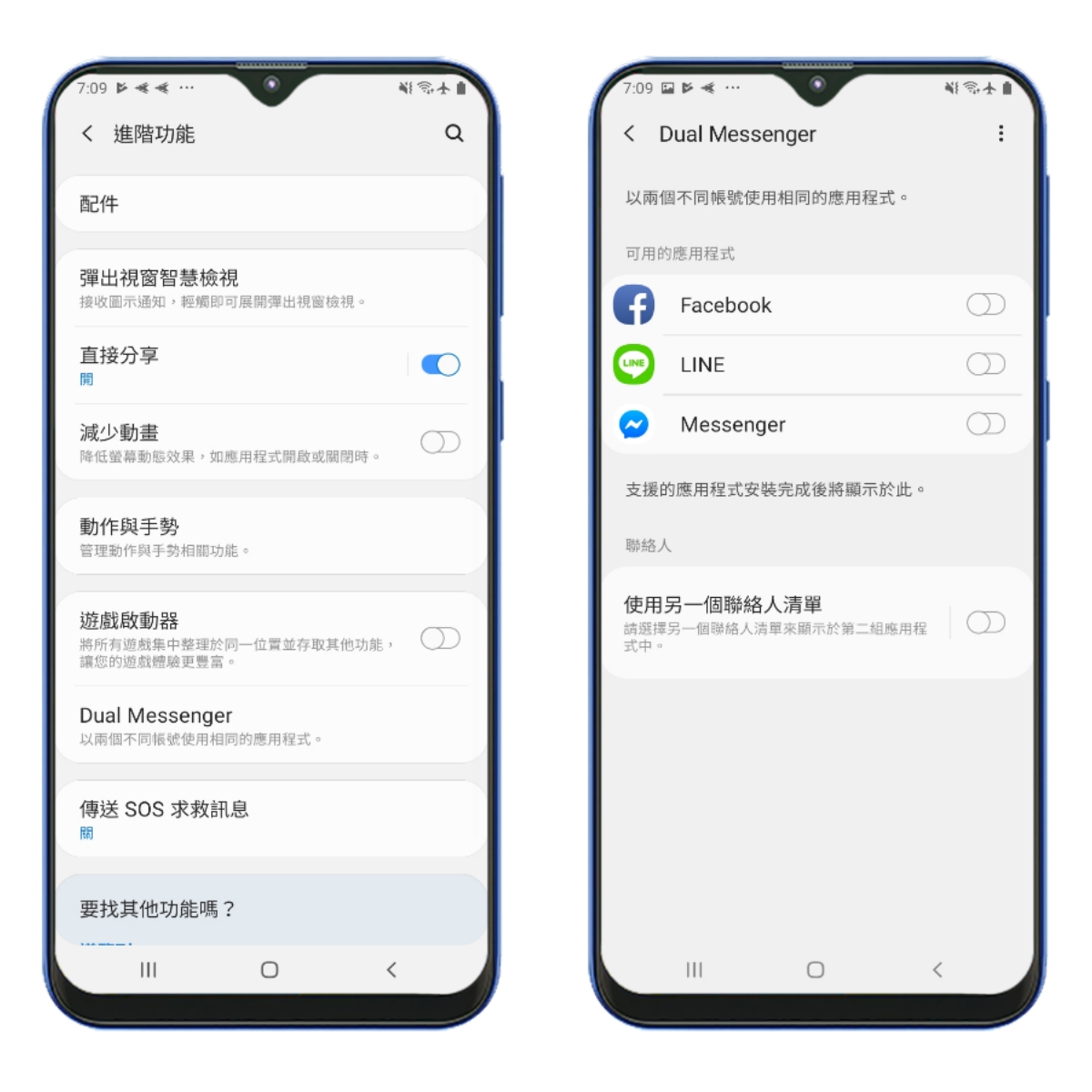 另外系統也內建了雙重帳號功能(Dual Messenger),主要是針對社群類的 APP 開啟第二應用程式,讓我們可以登入第二帳號,連聯絡人都可以獨立分開使用。